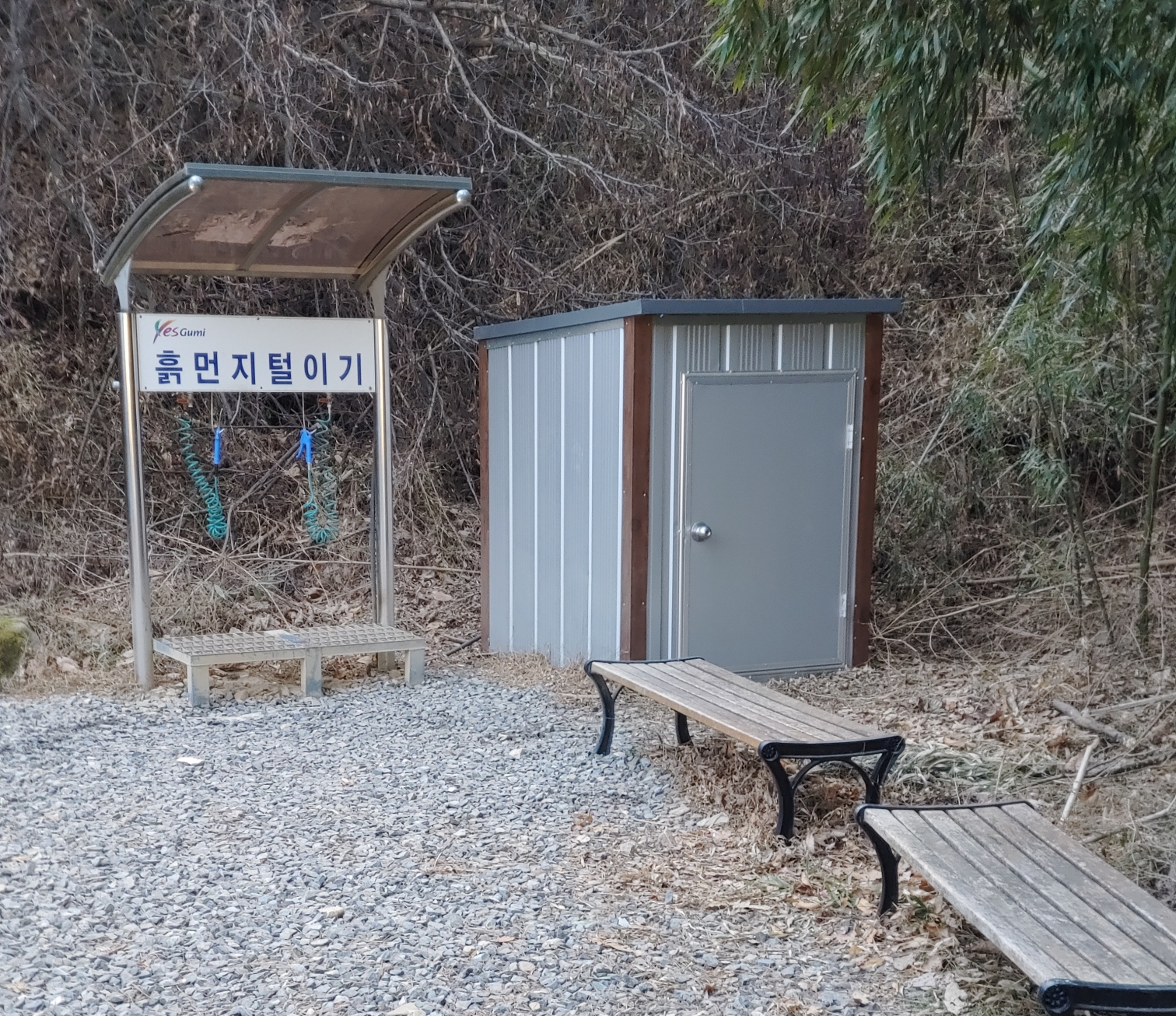 등산로에는 꼭 필요한 장치인 것 같습니다 상모동에서는 몇 군대 들머리가 있지만 이곳에 만 먼지털이가 있습니다.