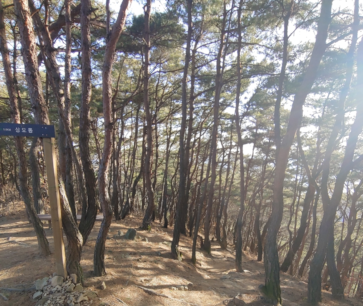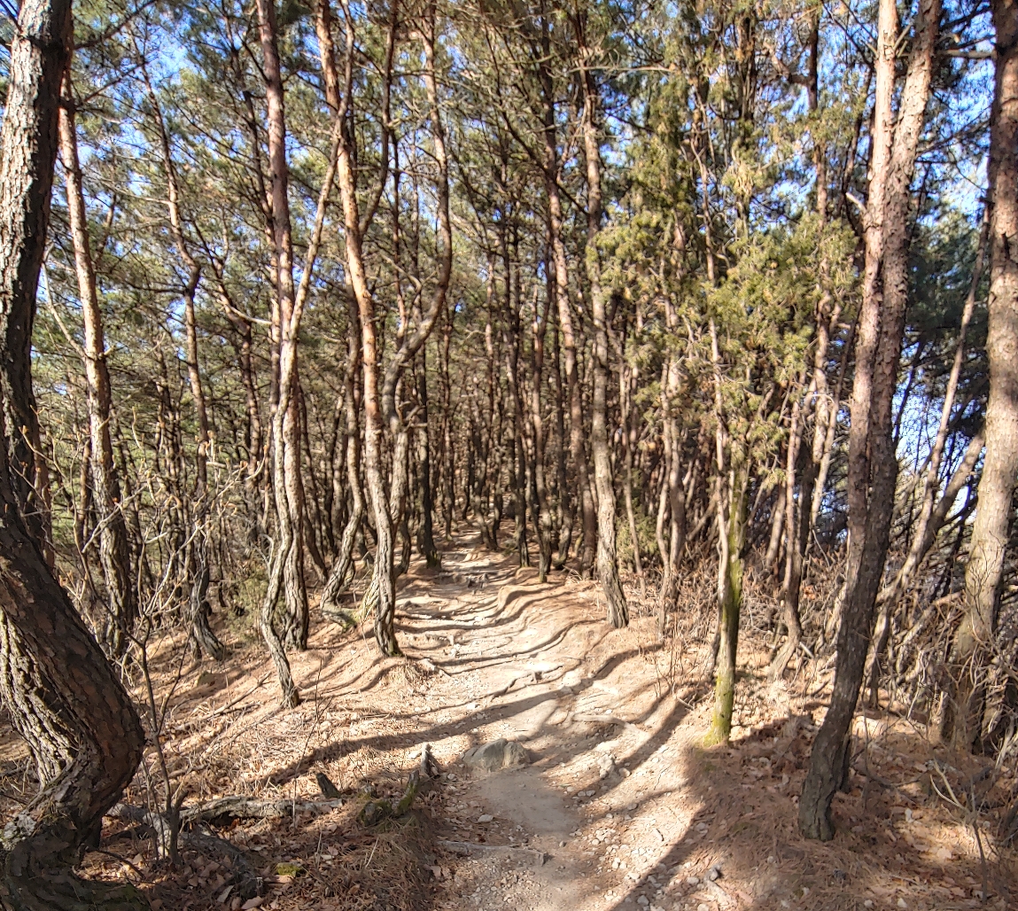 효자봉의 등산길은 산의 능선을 따라가는 길이고 소나무 숲으로 이루어져 있습니다.