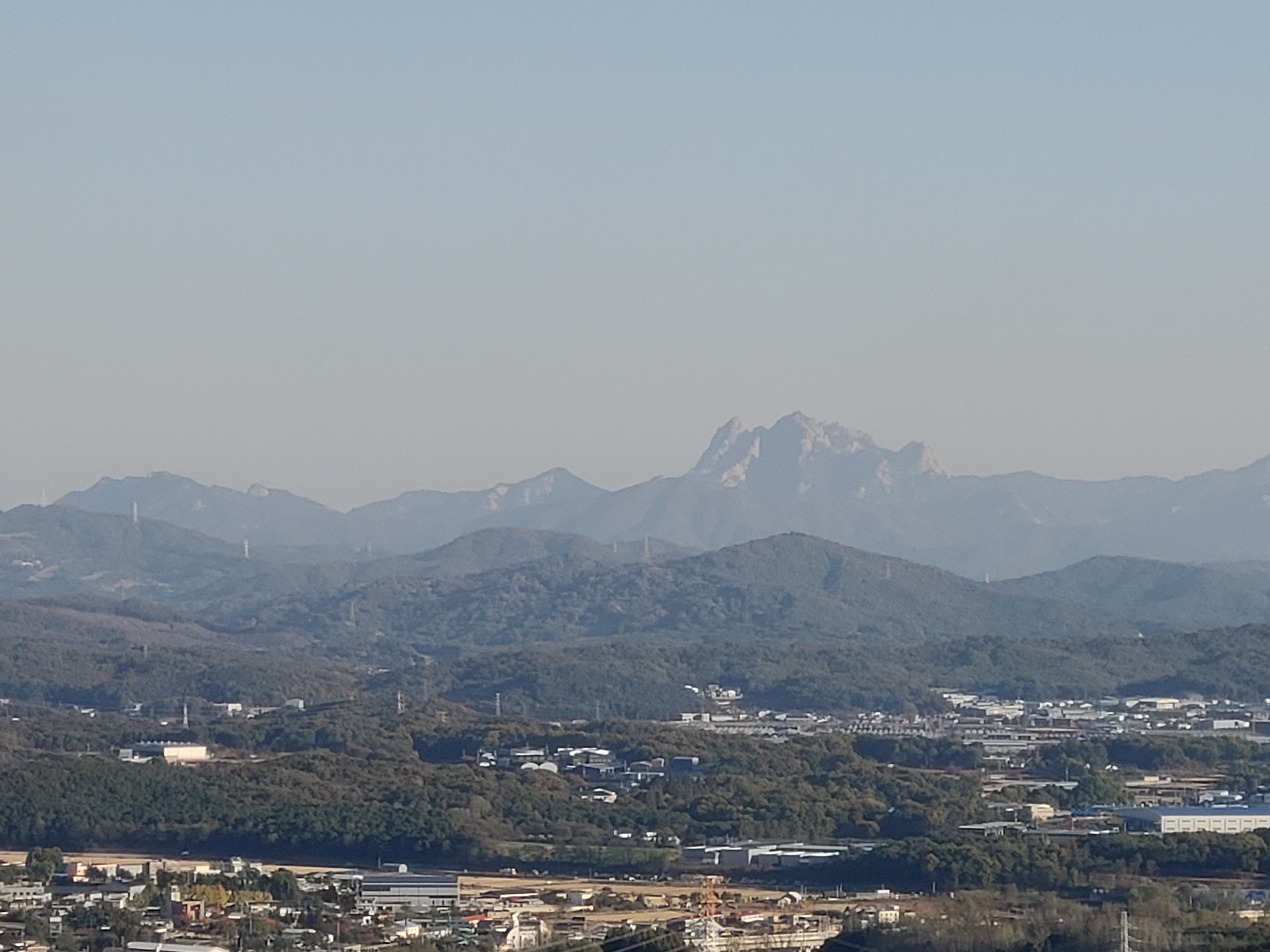 저 먼리 벼풍처럼 보이는 산이 북한의 송악산 부근입니다. 산맥처럼 보이기도 합니다. 봉우리가 많아 어느 것이 송악산인지 모르겠습니다. 개성 공단도 보이는 것 같습니다.