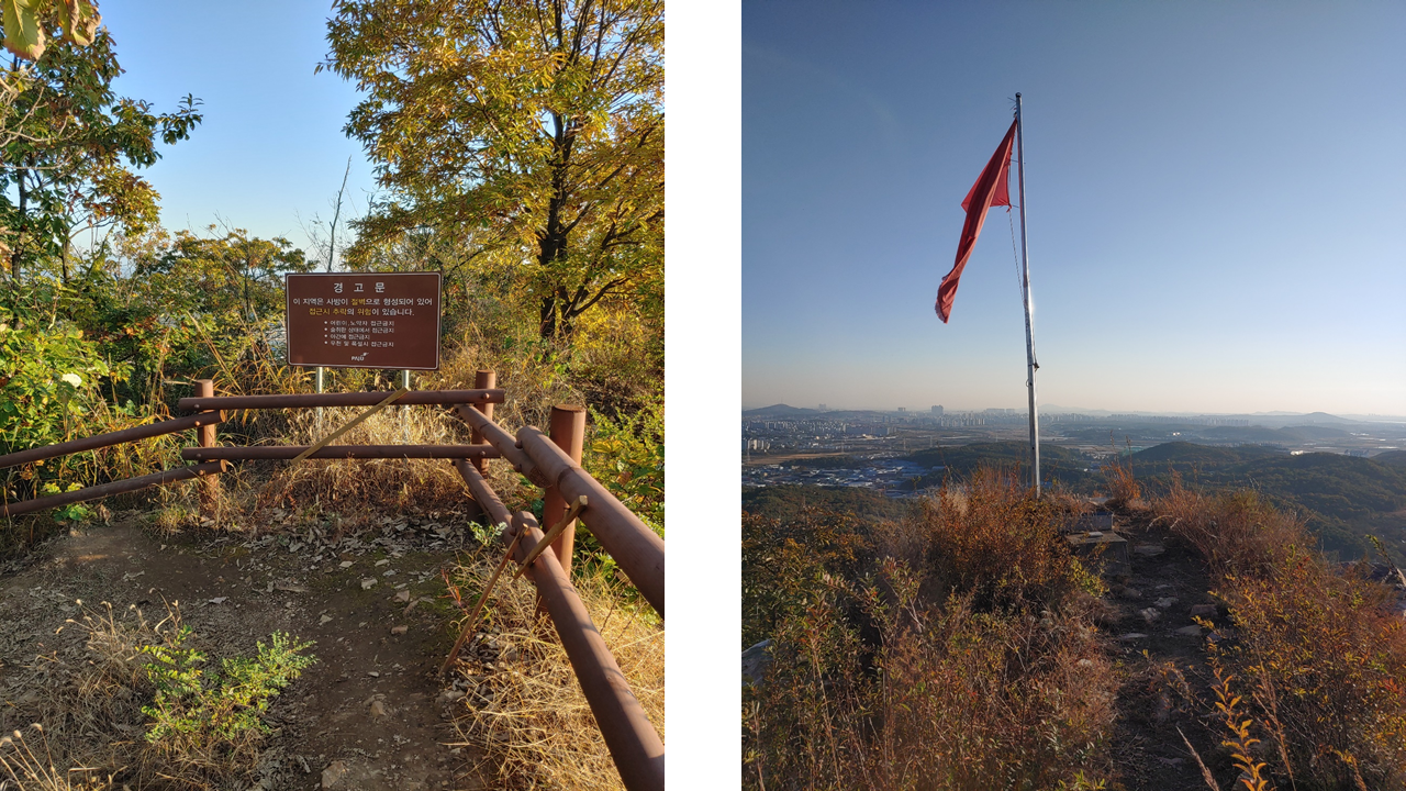 경고문은 바람이 많이 불어 조심하라는 문구가 있습니다. 울타리를 넘어서 가야 합니다. 파주 와서 처음 월롱산을 올랐을 때는 없었는데... 언제부턴가 울타라가 생겼습니다. 이곳은 탁 트인 전망을 볼 수 있습니다. 뷰를 보기에는 가장 좋은 장소입니다.