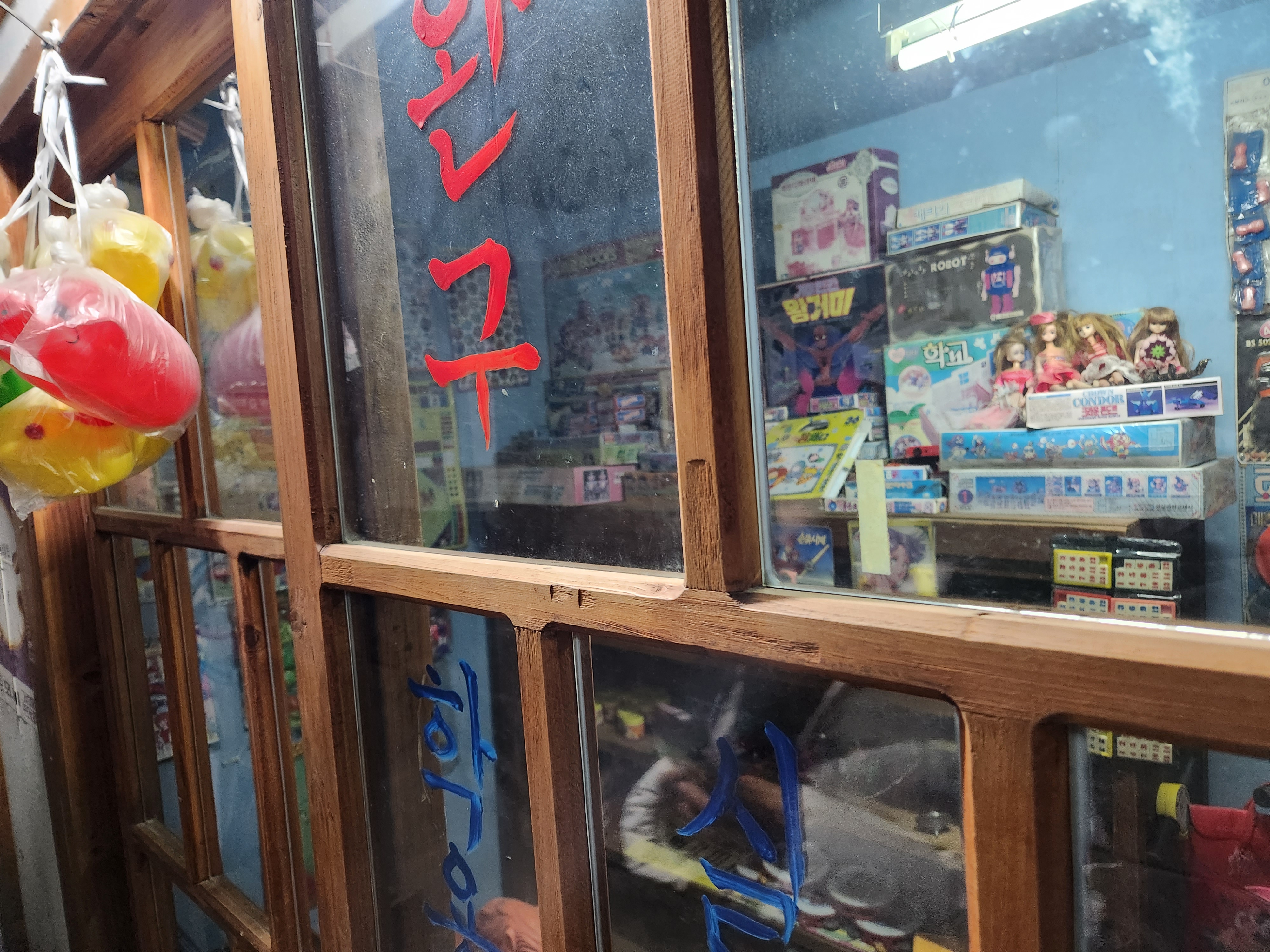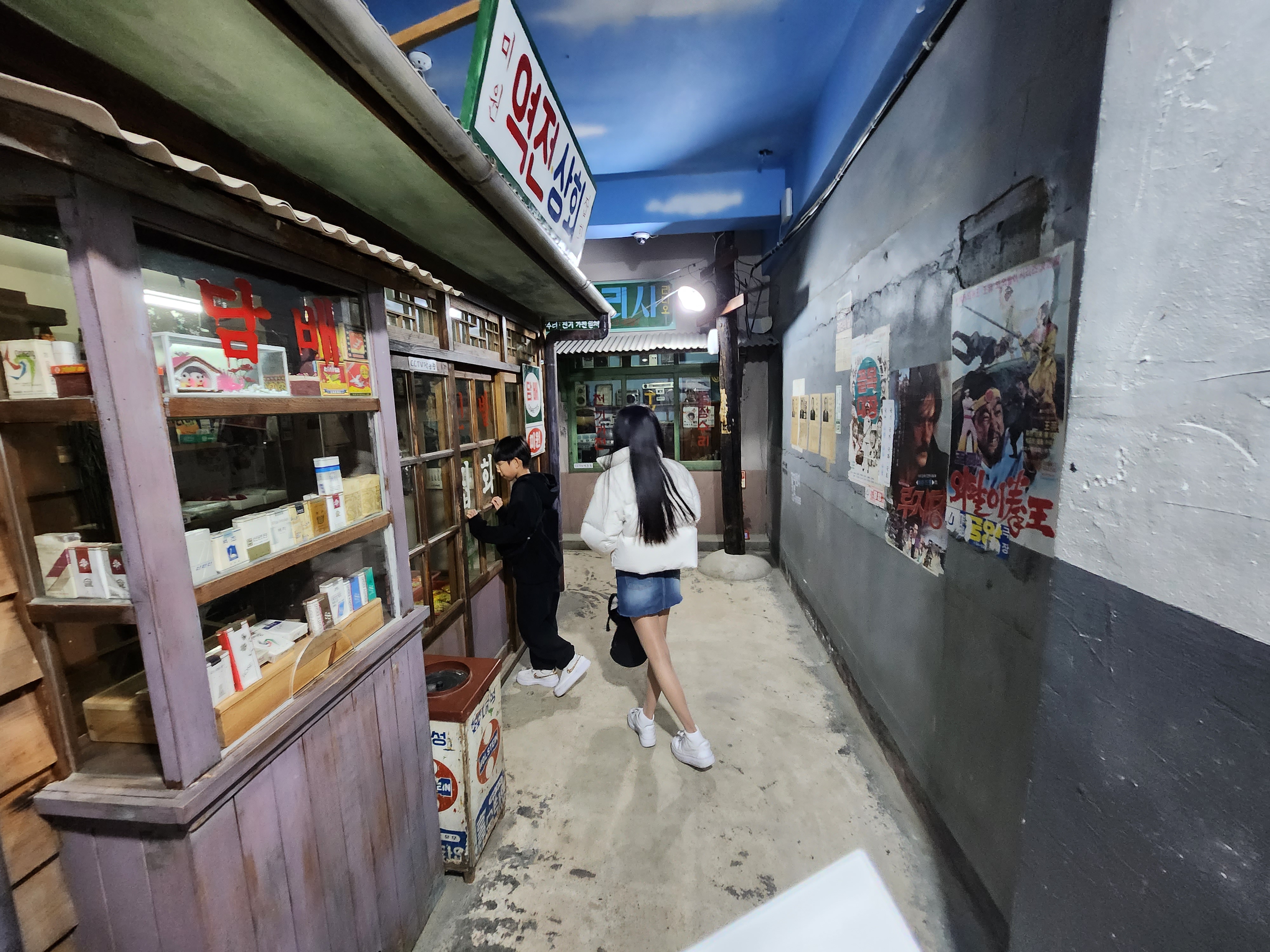 세월 흐름에도 당시 시대의 영화 포스트가 있었고 아들이 가장 관심을 많이 가진 문방구에서는 나의 어릴 적에 가지고 놀았던 종이 딱지, 구슬, 제기, 공기놀이 등이 있었습니다.