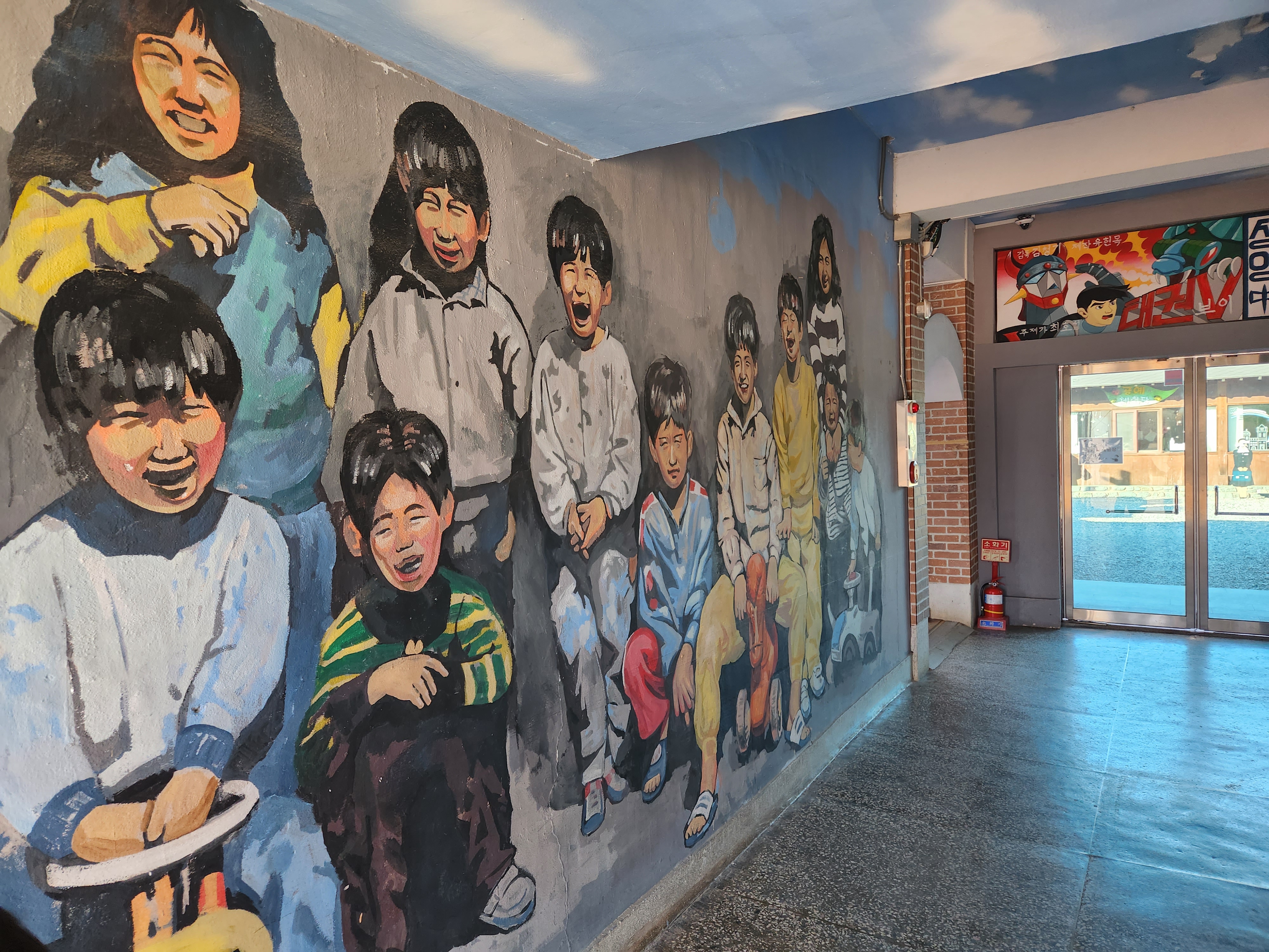 중앙 현관에는 아이들의 모습을 그려놓은 벽화가 있습니다. 중앙 현관을 중심으로 왼쪽은 60~70년대 교실과 일상생활에 사용된 물건들이 전시되어 있으며 오른쪽은 60~70년대의 화본 마을을 재현해 놓았습니다.