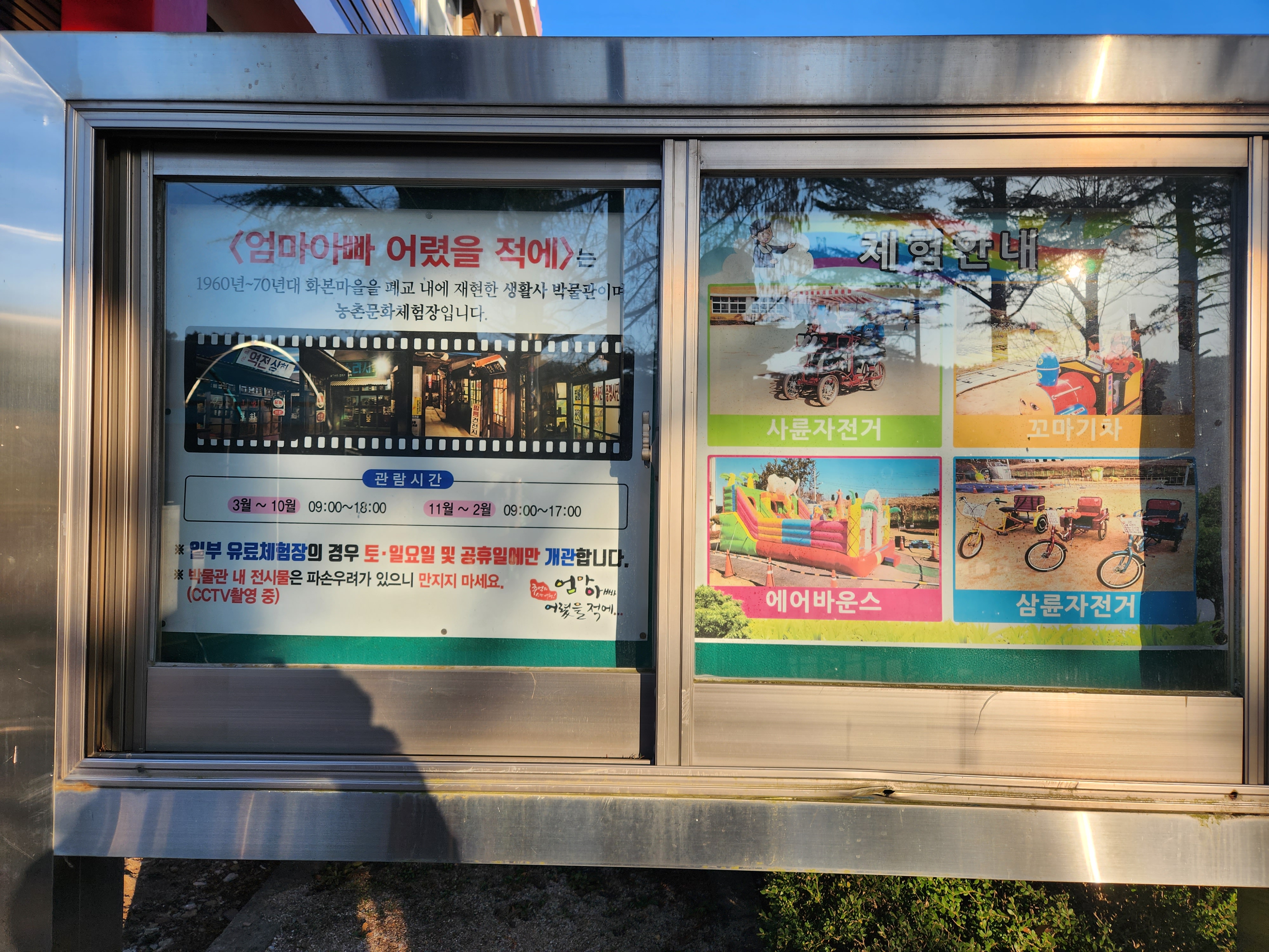 60~70년대 시대에서는 너무 흔한 생활용품과 책들 그리고 당시 시대에 상점과 가게들 잘 재현해 놓았습니다. 폐교된 학교를 이용하여 만든 곳으로 운동장과 학교 건물 뒤쪽으로 체험을 할 수 있는 체험관도 있어 아이들에게 좋은 추억과 재미를 느낄 수 있는 장소이기도 합니다.