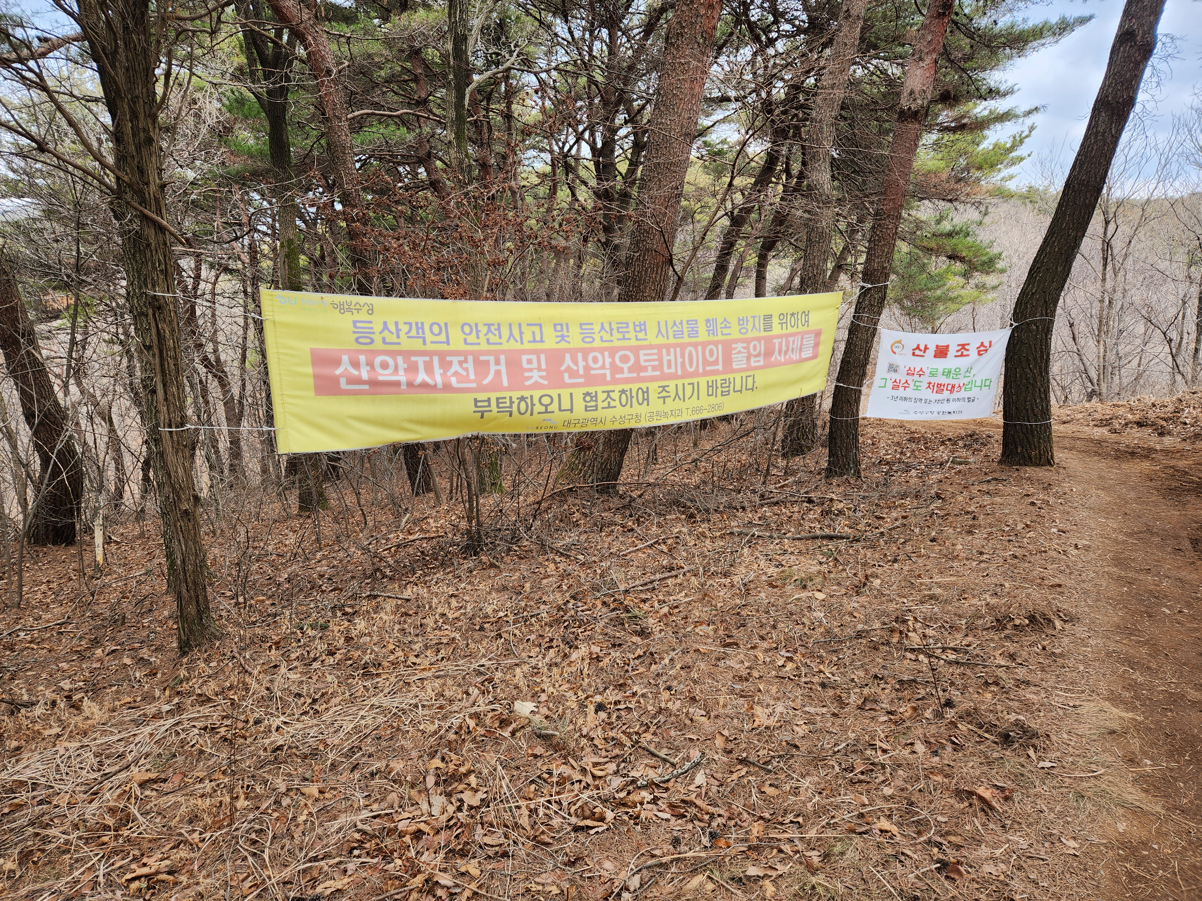산악자전거나 산악 오토바이들이 다닐 수 있을 정도로 넓은 등산로로 이어지는 하산길입니다. 협조를 부탁하는 현수막이 있습니다.