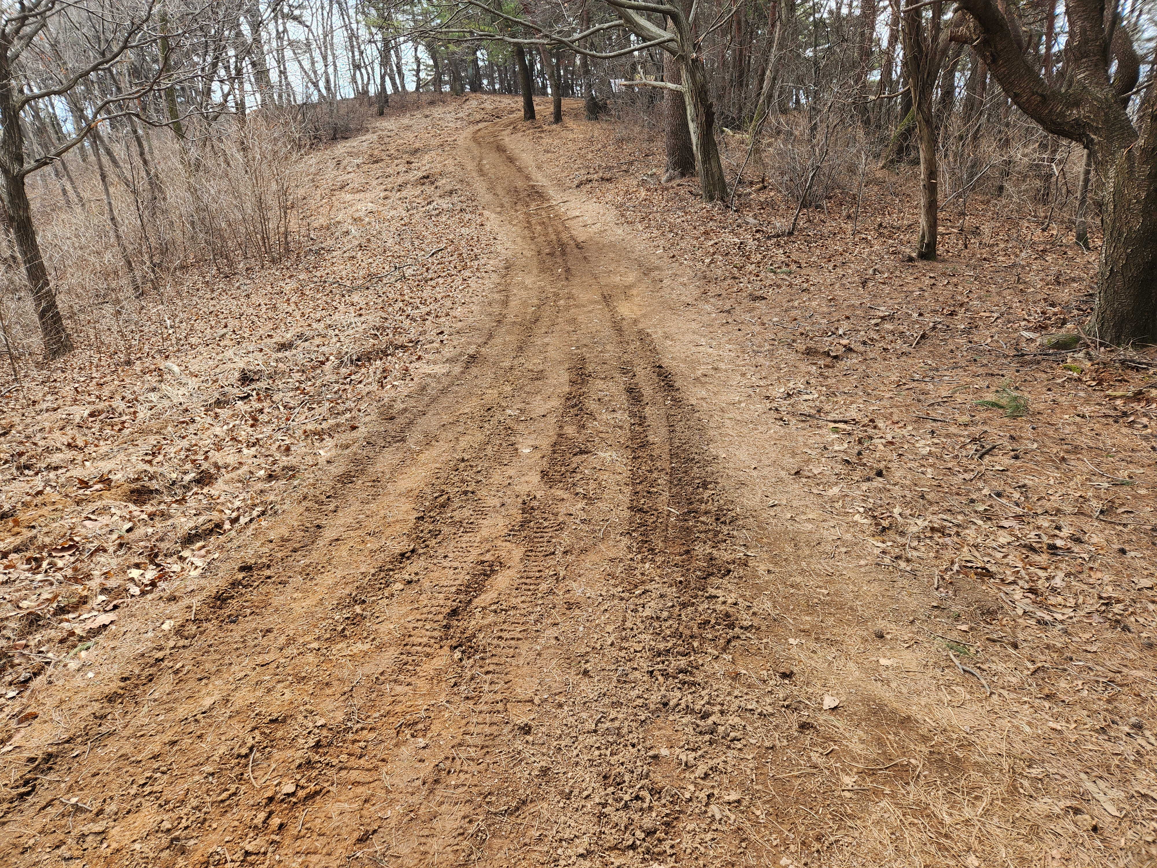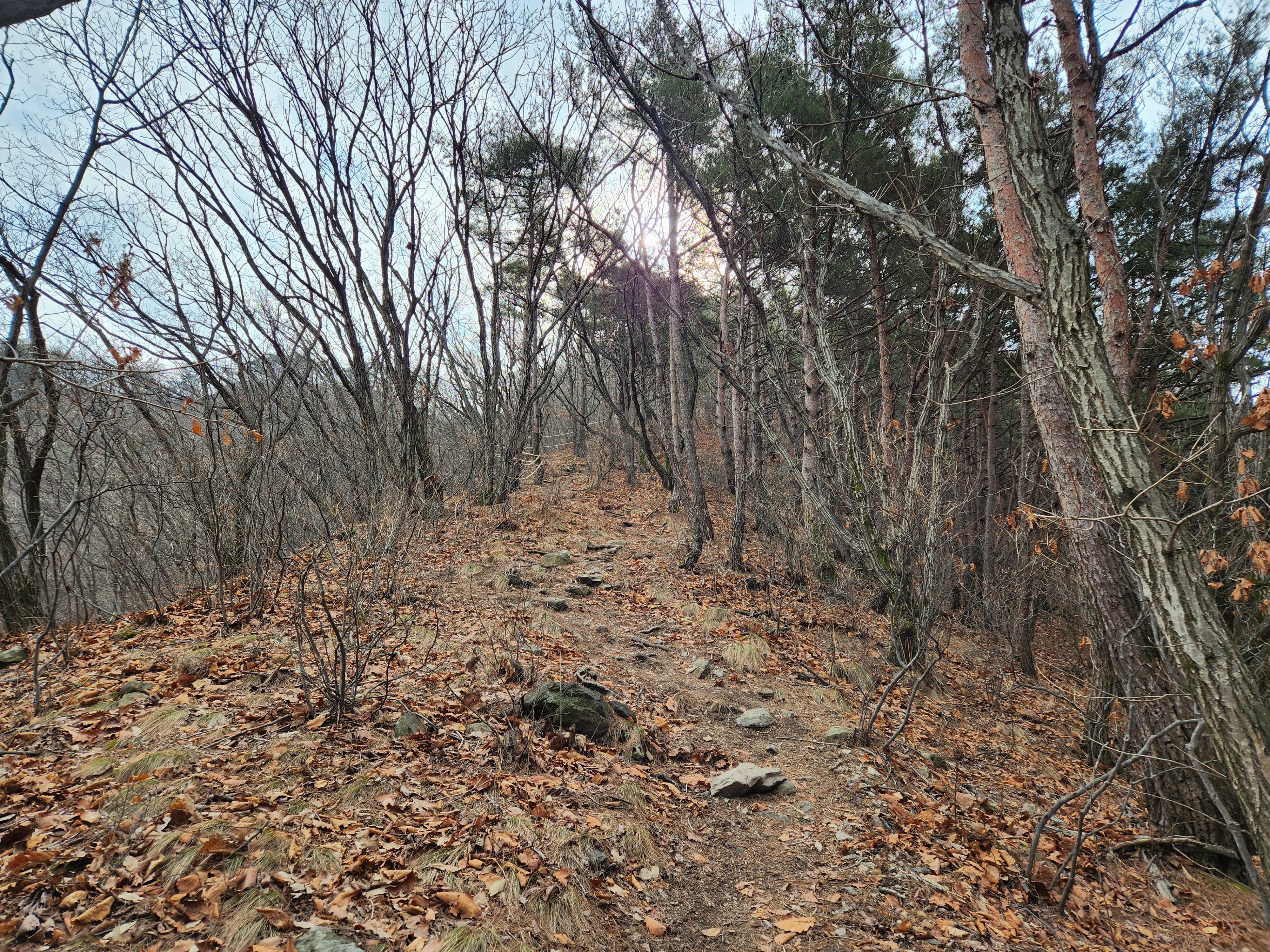 등산 초입부터 가파른 오르막길은 당행이 긴 오르막이 아니었습니다. 오르막을 올라오면 산을 능선을 타는 등산로가 나옵니다. 완만한 등산로에서 가쁜 숨은 고르고 물을 한잔 마시며 조금 여유롭게 등산을 이어 갈 수 있습니다.