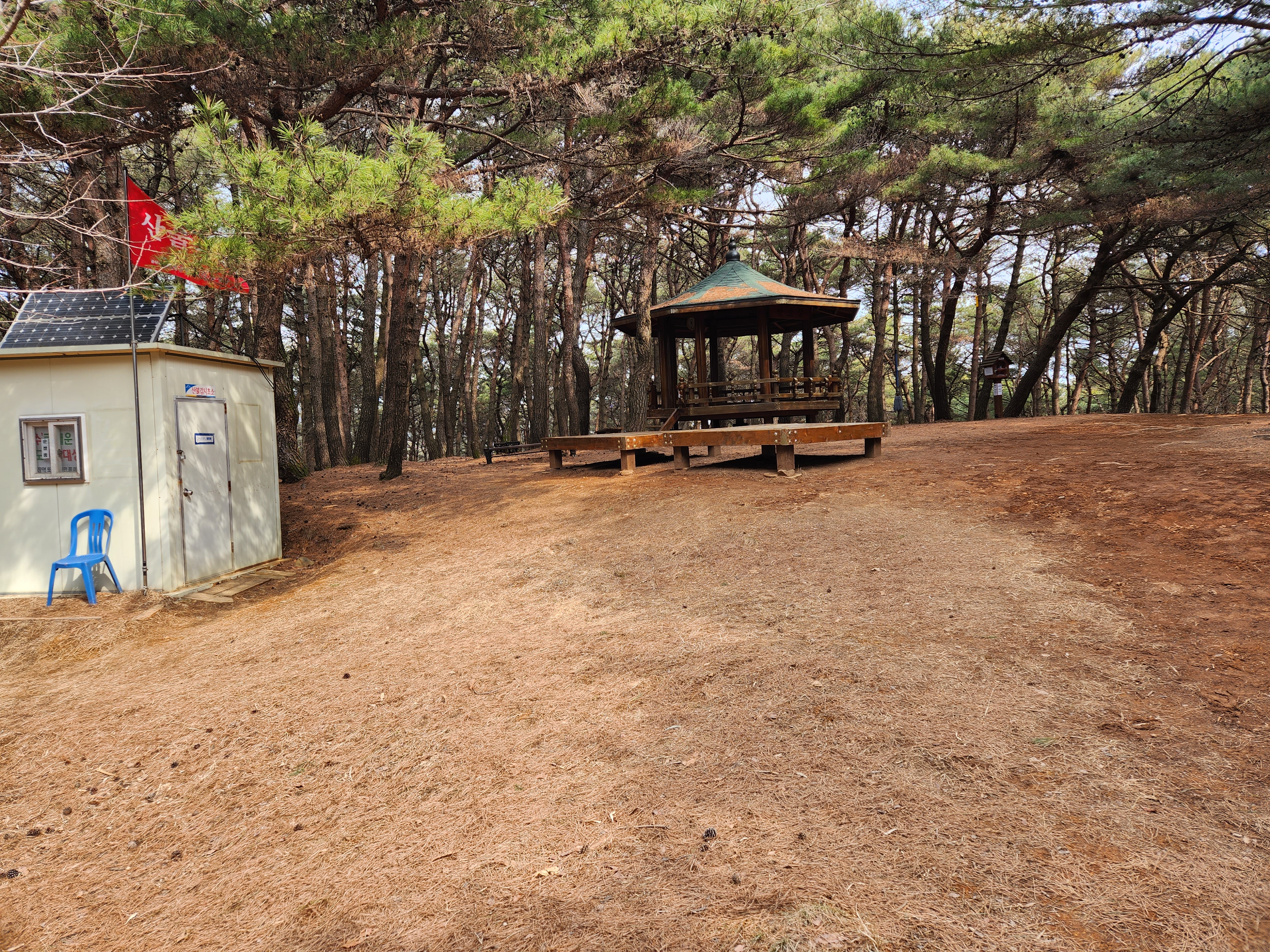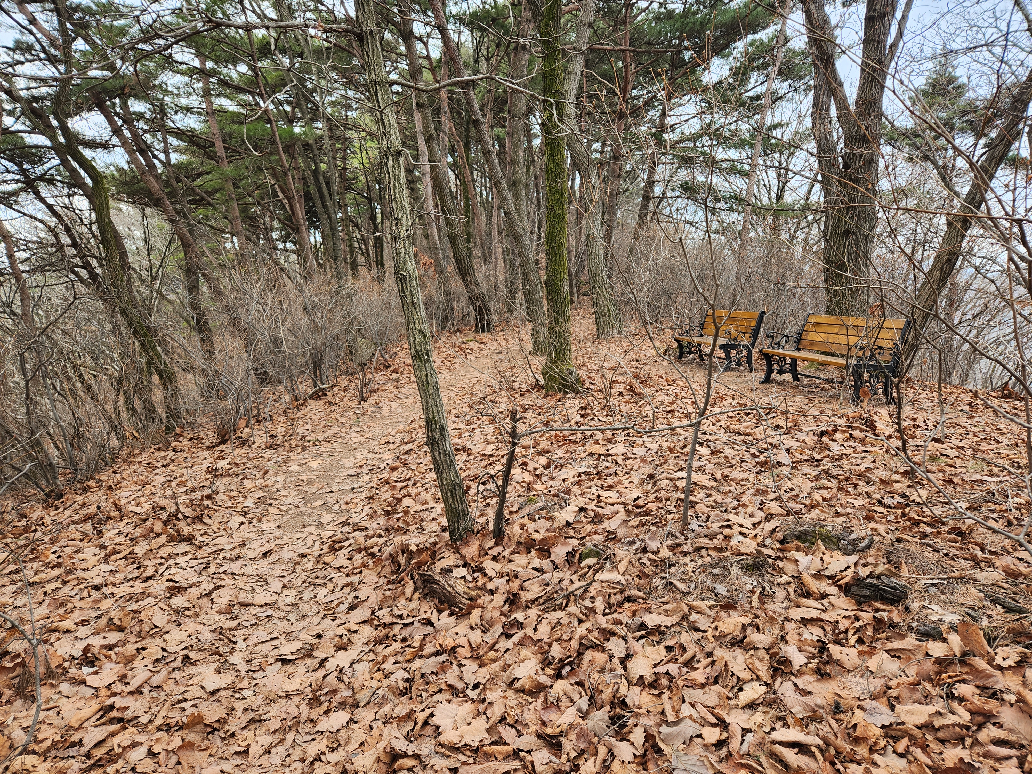 정상은 나무에 가려져 전망이 없습니다. 대신 의자가 있어 편히 쉴 수 있습니다.