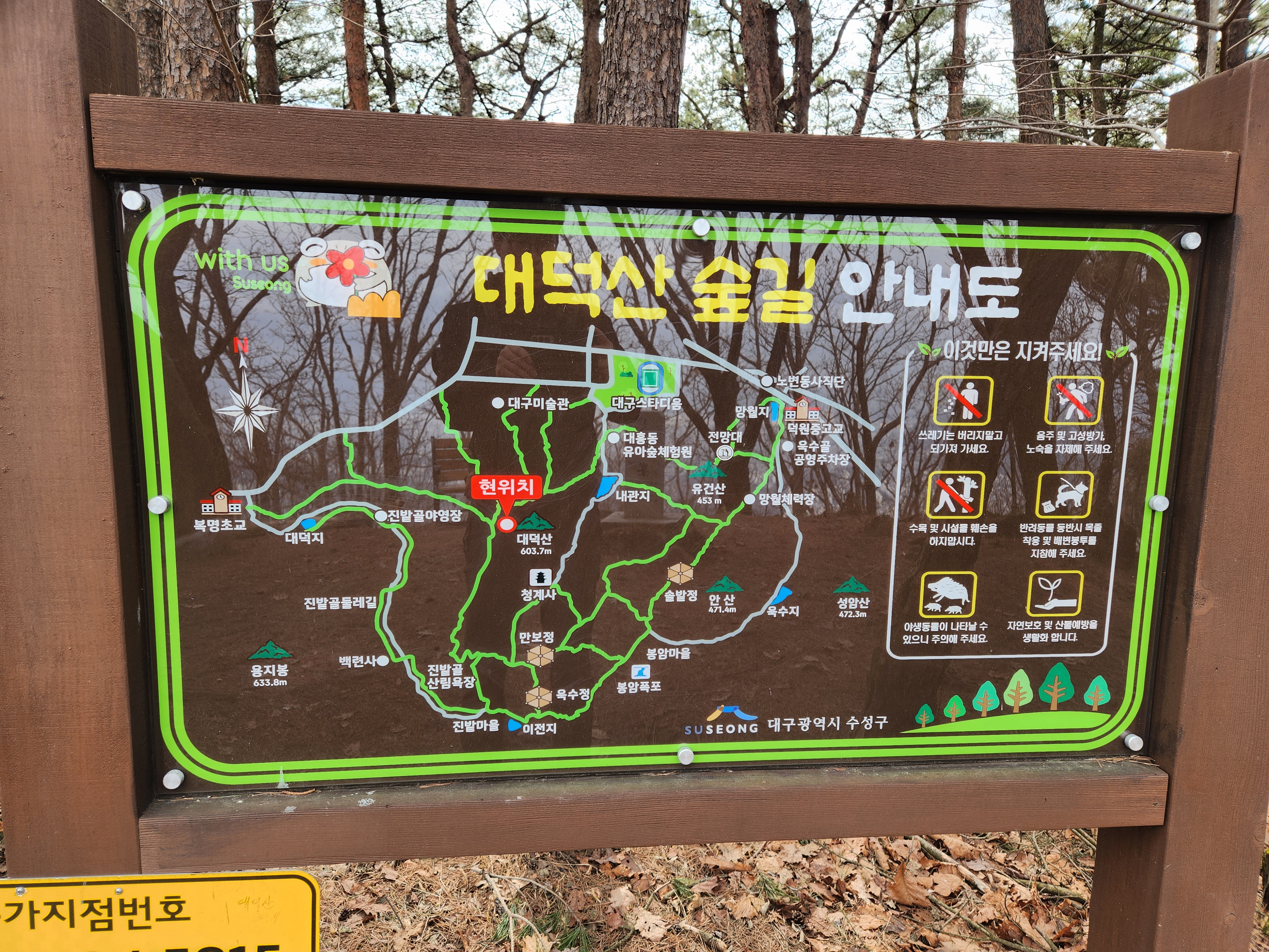 대구 산 수성구 대덕산 등산 코스 복명초 대덕산 정상 진밭골 둘레길 하산 원점회귀 등산코스 소개입니다.