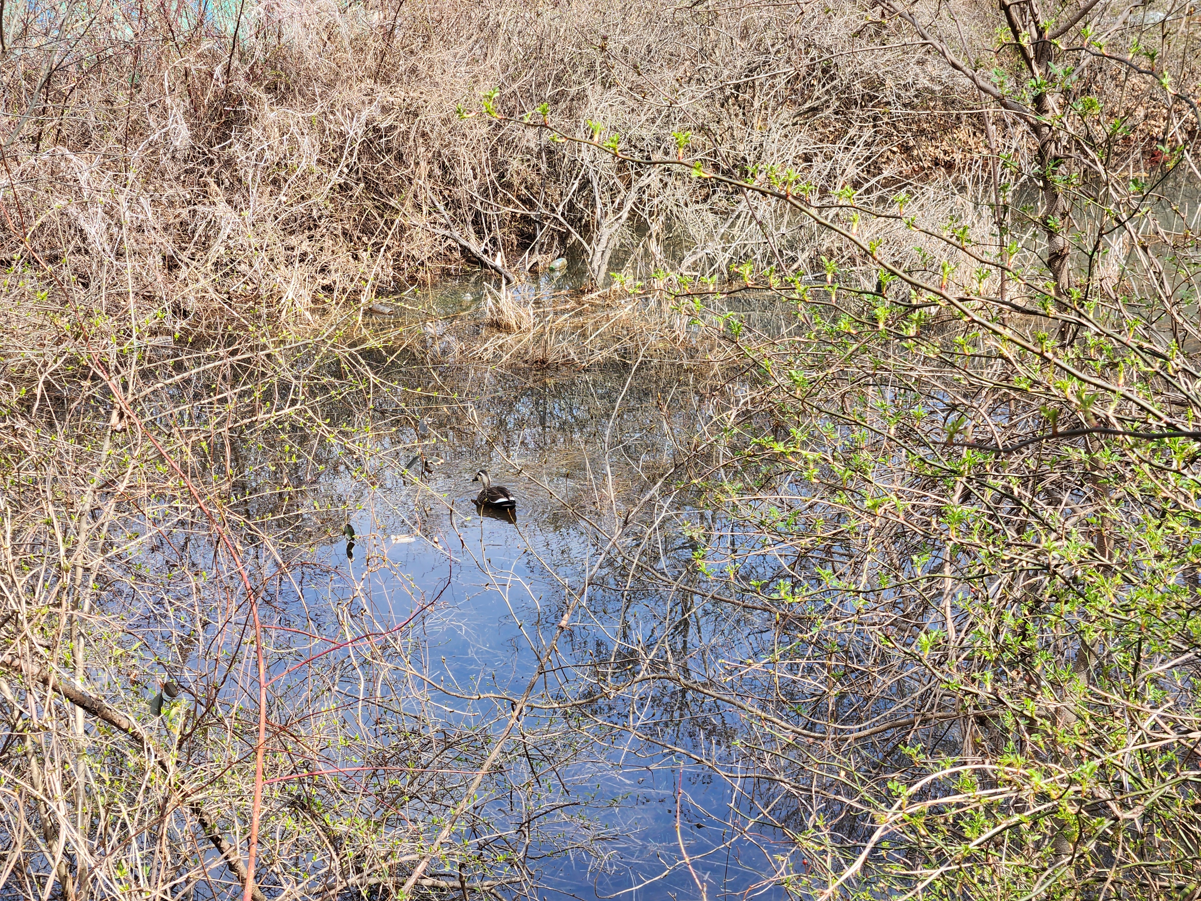 진밭골 내려가는 길에 작은 연못에서 오리 한 마리가 여유롭게 수영을 하고 있는 모습입니다.