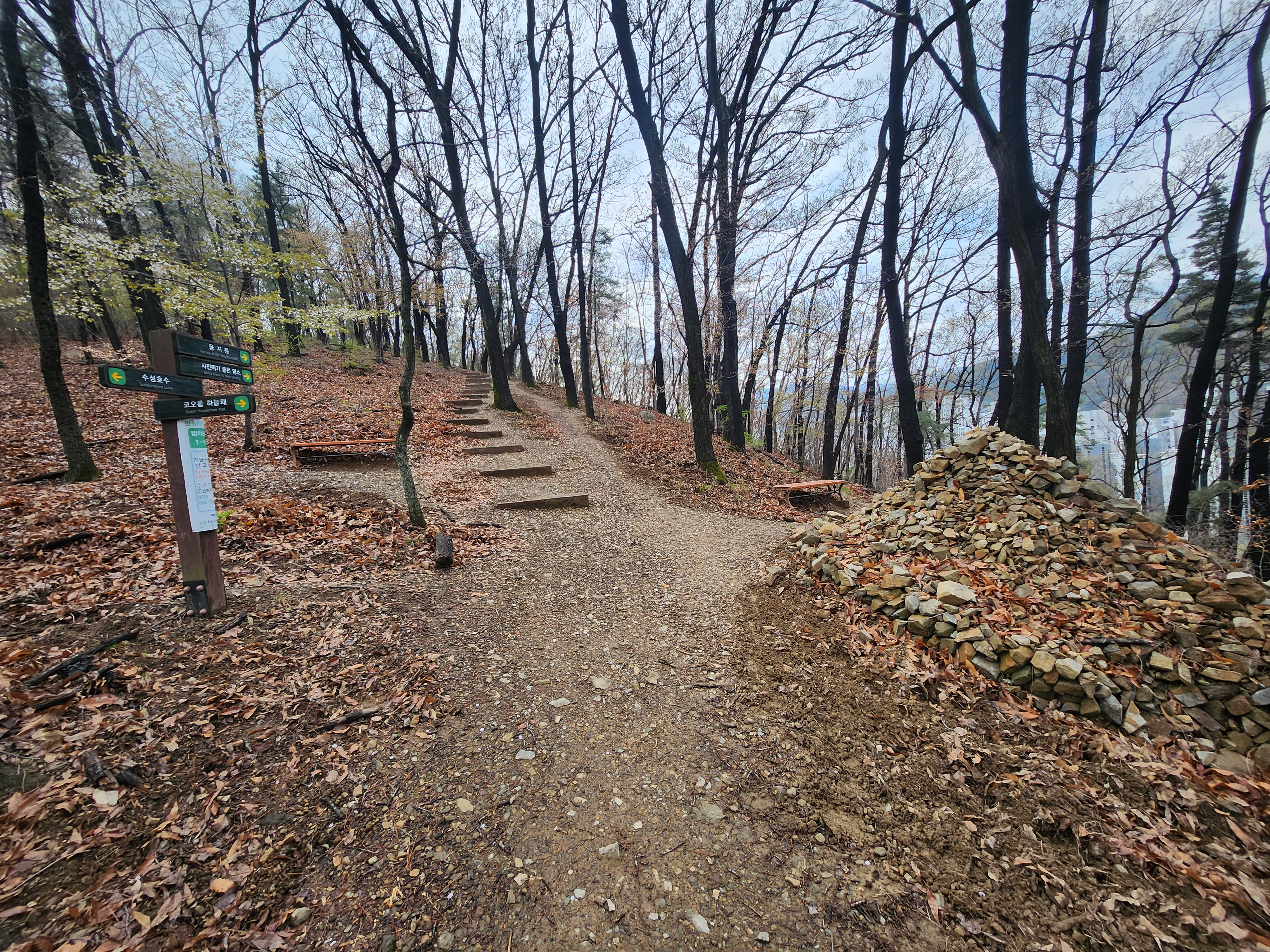 본격적인 등산을 시작합니다. 숲 속 산책길은 정비가 잘 되어있었고 등산로도 완만하고 이정표도 잘 설치가 되어 있었습니다. 돌탑이 무너진 것인지 돌탑을 만들려고 하는 것인지 모르지만 많은 돌무더기가 있었습니다.