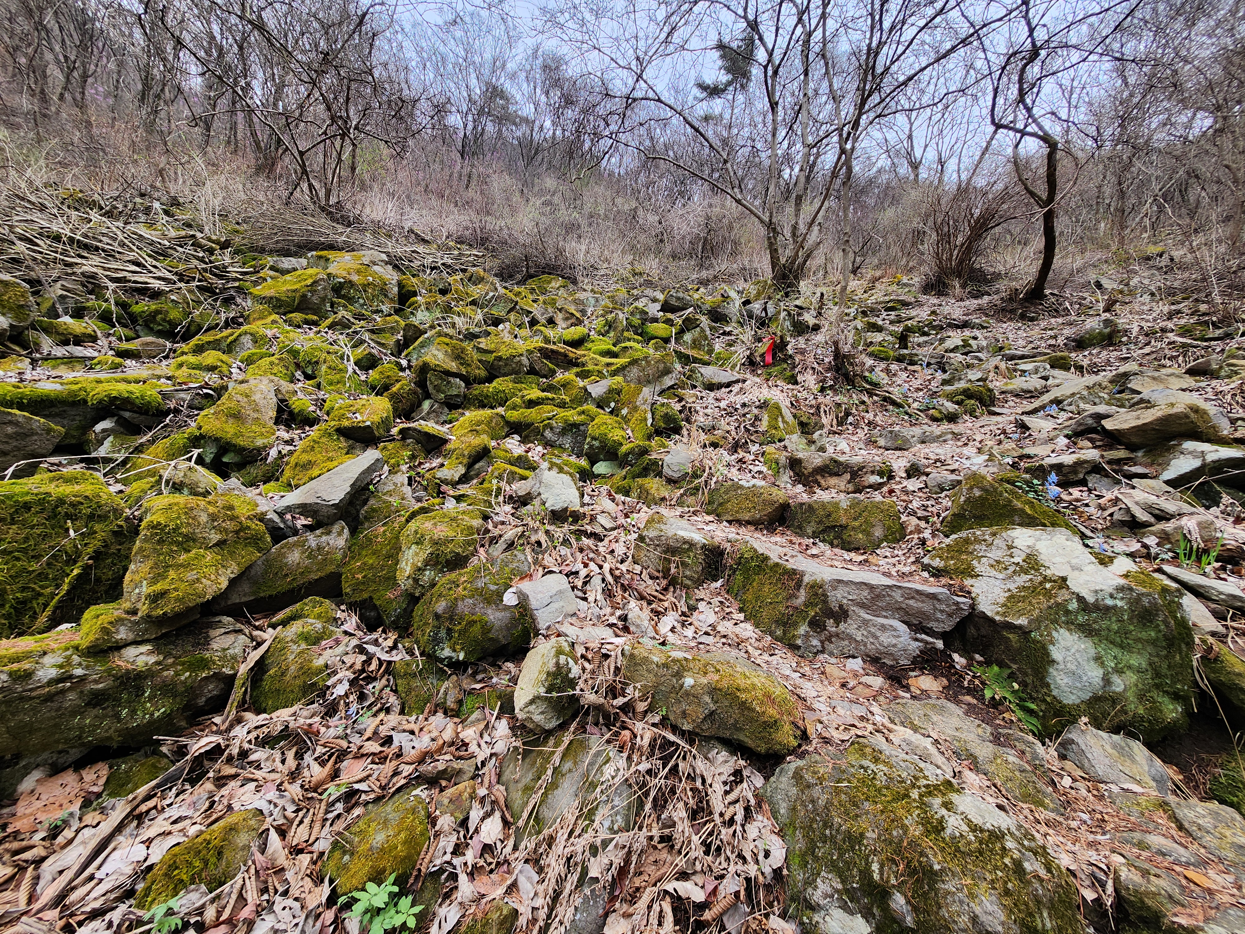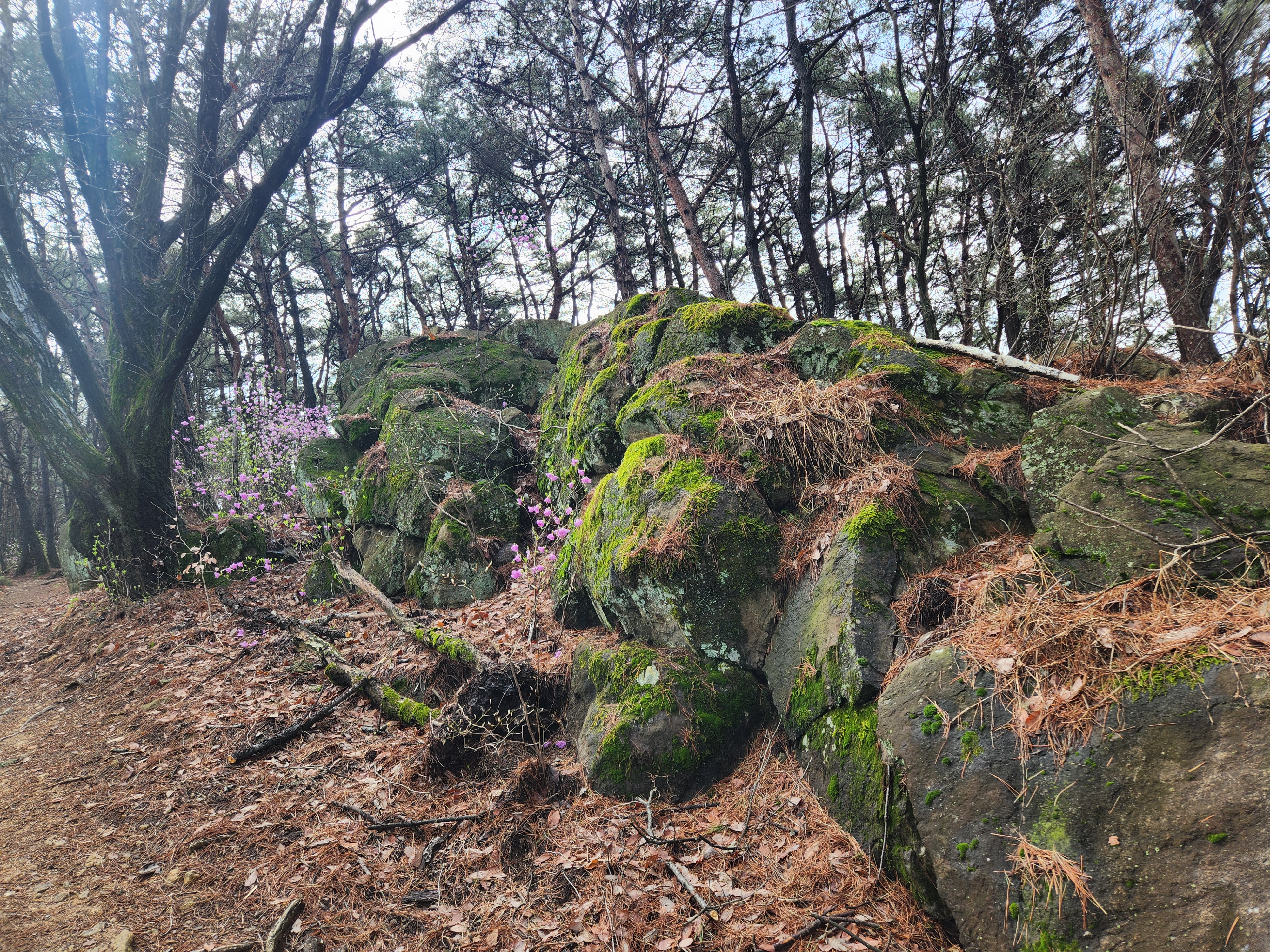 흙길로 이루어진 산에 큰 바위 덩이가 길게 모여있는 장소입니다. 바위에는 이끼가 있었고 진달래 꽃은 바위 주변에 피어있습니다.