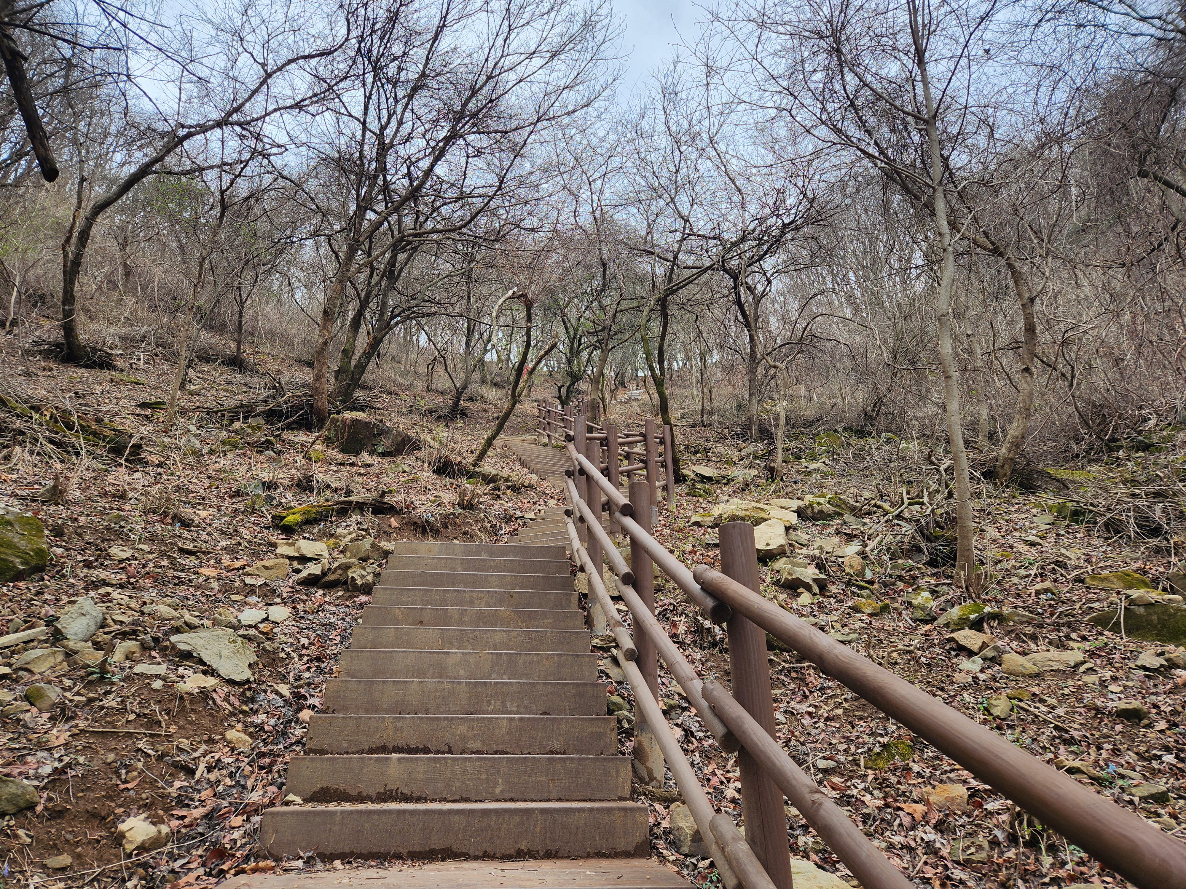 수성못 용지봉 등산코스 중 가장 힘든 구간이라고 생각됩니다. 데크 계단으로 이루어진 오르막길입니다. 어떤 산이나 계단의 오르막이 더 힘이 들지만 등산로에 꼭 필요한 장소에 만들어져 있어 등산객들에게 좋은 경치와 안전한 등산을 하게 해 줍니다.