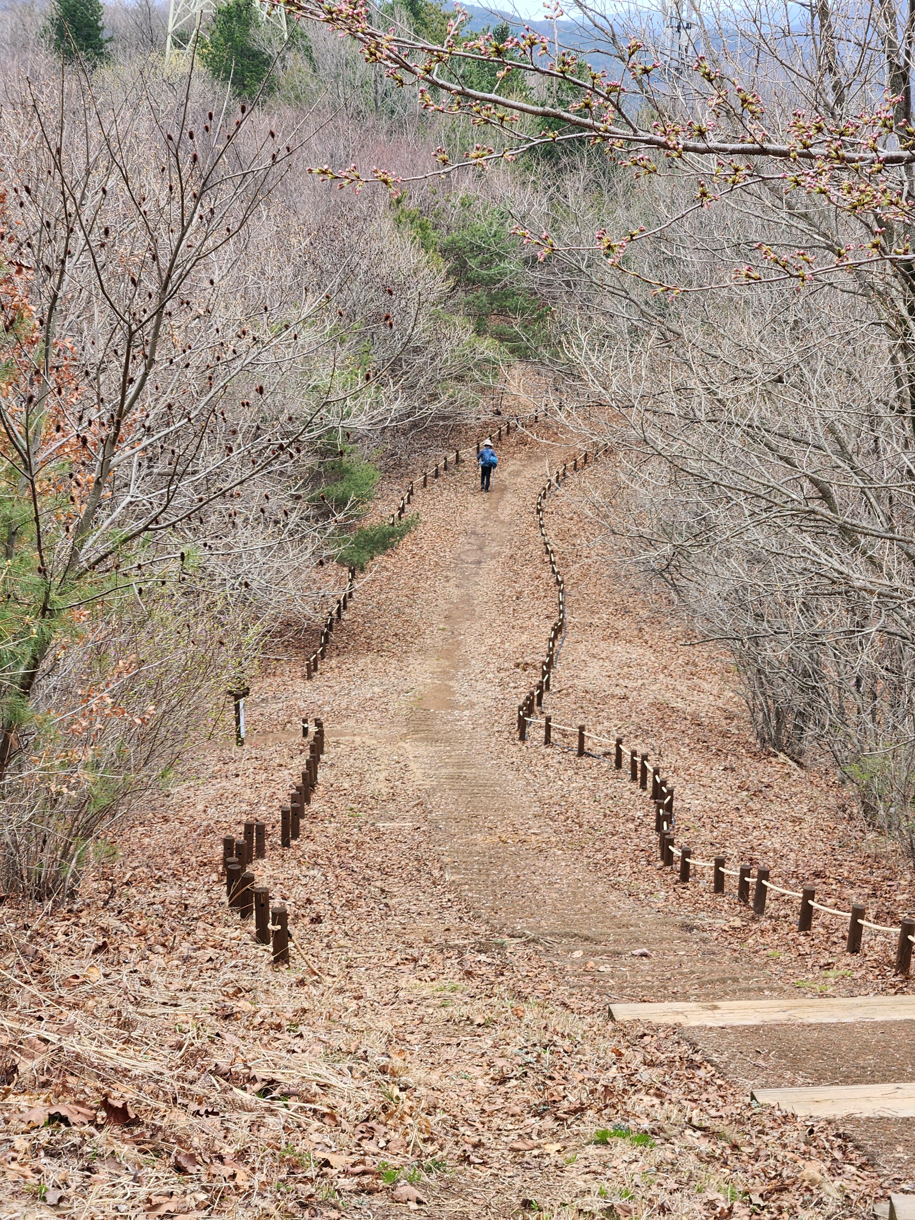 하산은 용지역 방면입니다. 다른 등산객은 먼저 앞서 가고 있습니다. 등산로 잘 정비하여 사진을 찍어니 이쁘게 잘 나오는 것 같습니다.