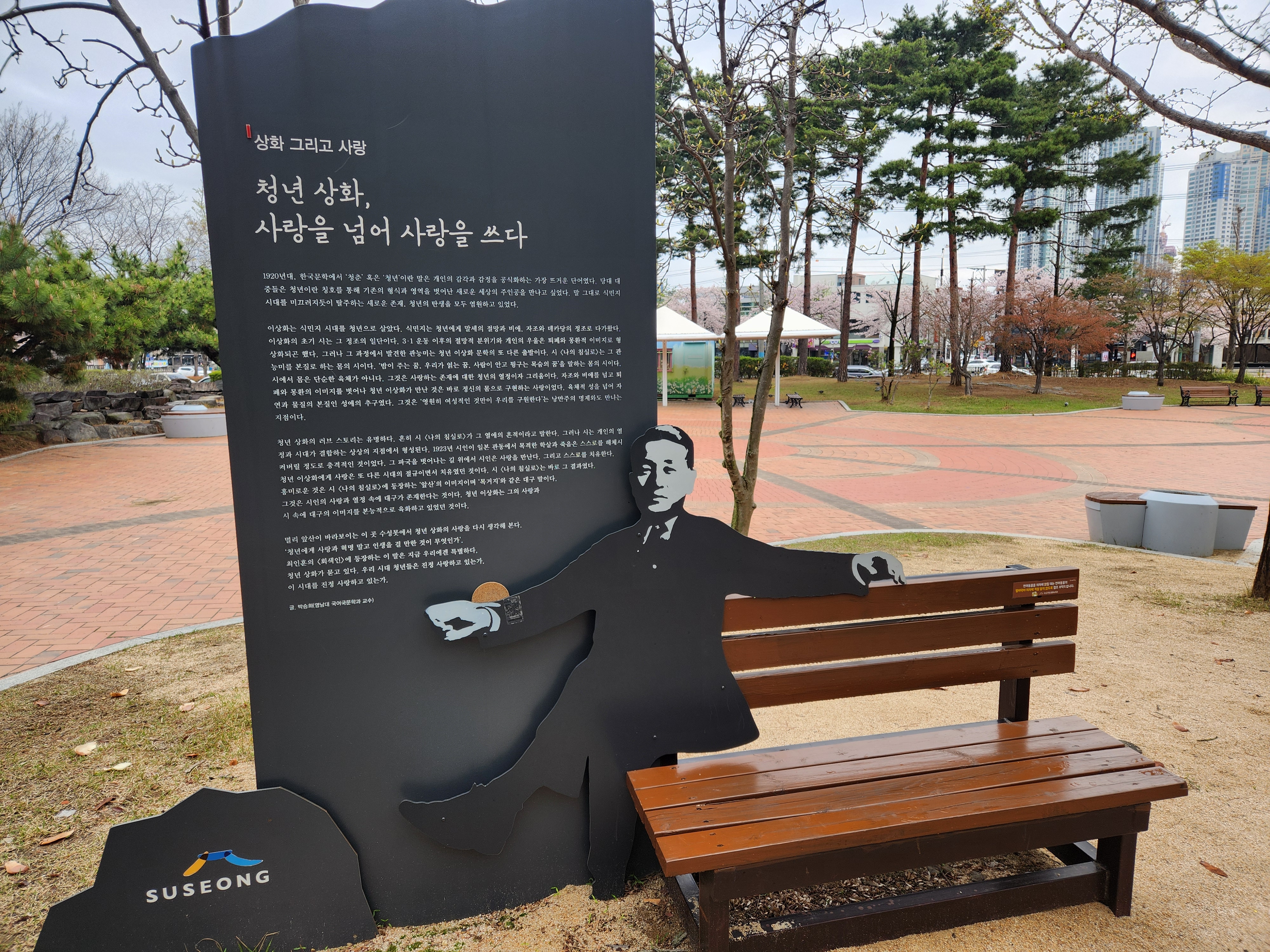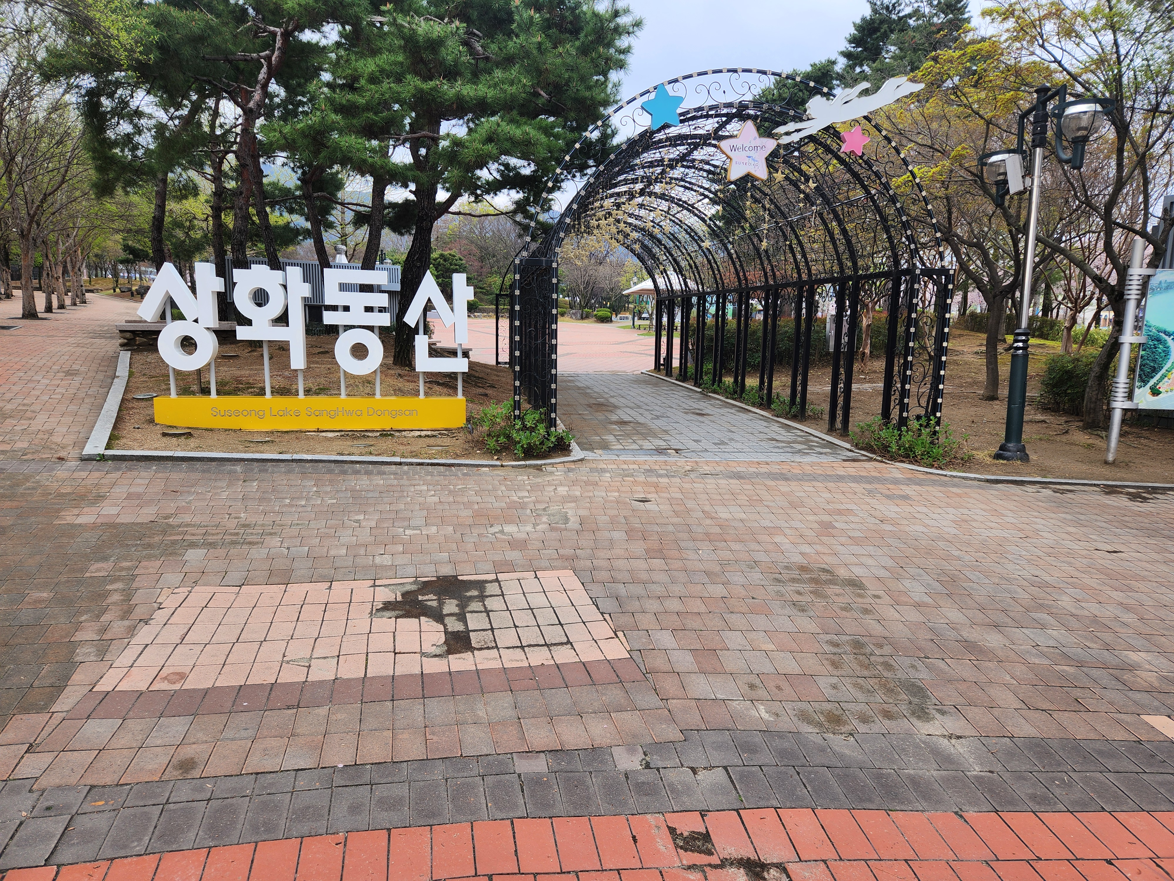 대구 수성구 용지봉산행은 수성 못에서 출발하는 등산코스입니다. 3호선 지하철을 타고 수성못역에 내려 수성못 산책길을 이용하여 수성못 유원지 쪽에 있는 등산로를 이용하는 산행입니다. 수성못 입구에 상화동산입니다. 이상화 선생님을 기념한 공원인 것 같습니다.