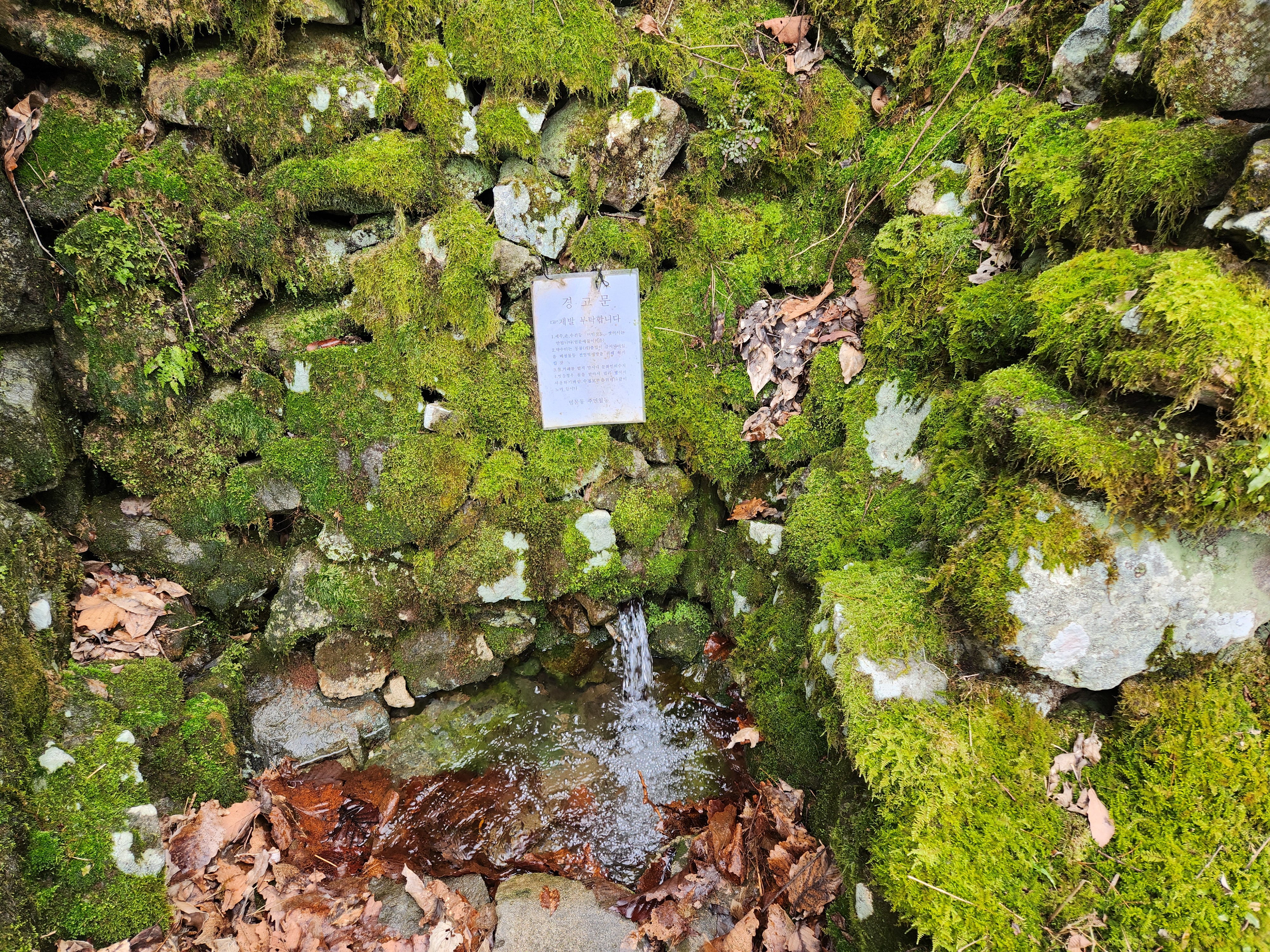 약 500m의 가파른 등산로를 내려오면 체육 시설이 있는 공원이 나옵니다. 며칠 전 비가 온 탓에 옹달샘에 물이 흐르고 있었습니다. 맑고 깨끗한 물이지만 약수 물은 아니기에 마시면 안 된다는 경고문이 있고 누군가가 만들어 놓은 경고문도 있습니다.
