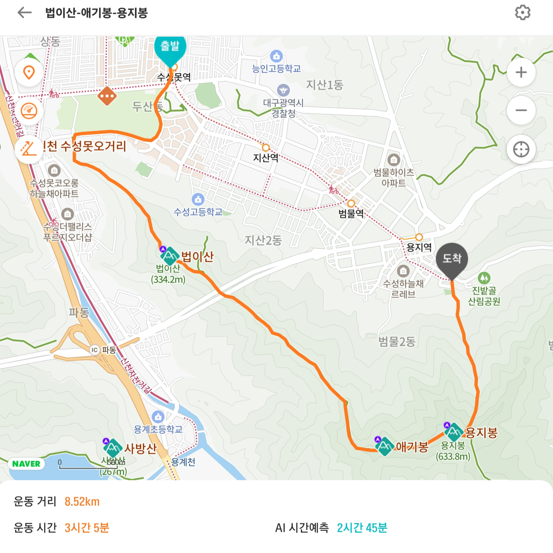 수성못역 -> 수성못 -> 법이산 봉수대 -> 애기봉 -> 용지봉 -> 범물동 두성아파트 -> 용지역