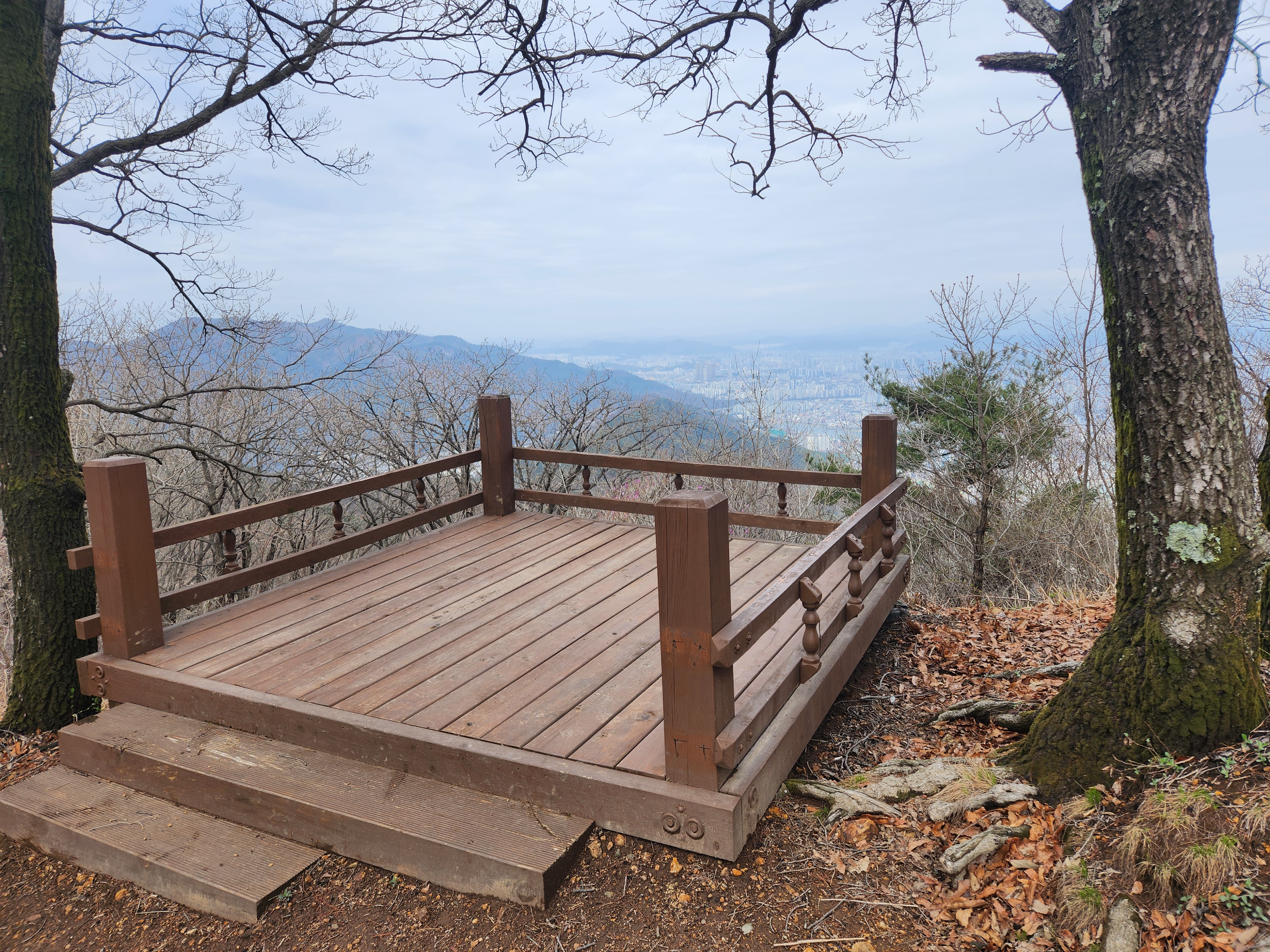 용지봉으로 오르는 오르막길에 작은 전망대가 있습니다. 수성못과 대구시가지가 잘 보이는 장소입니다. 멀리 성서지역도 잘 보이는 장소입니다.