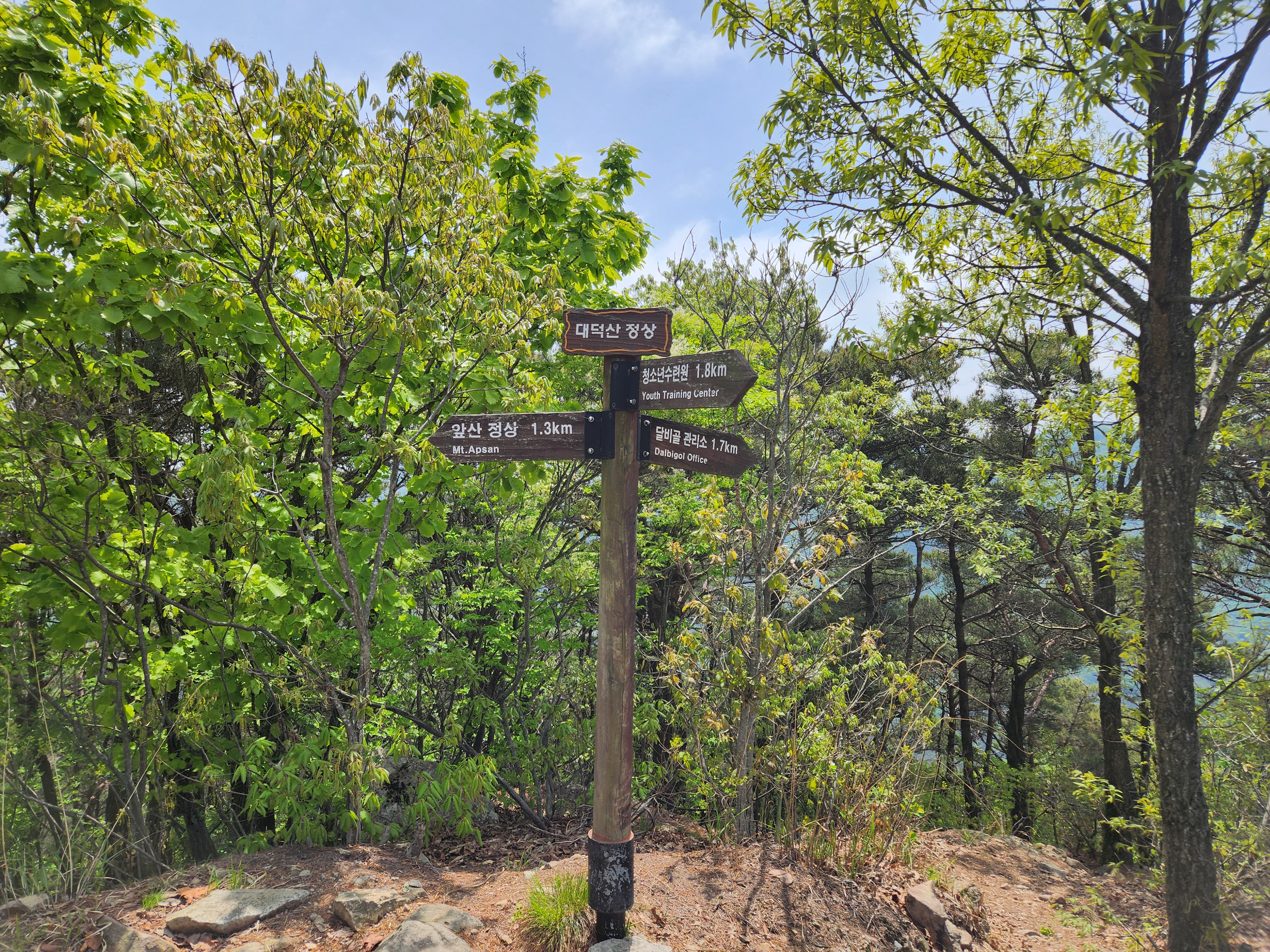 대덕산 정상까지 1.5km 남았습니다. 오르막 길이라 힘든 구간입니다. 하지만 이 지점까지 올라오면 가파른 오르막 구간은 없습니다. 잠시 걸음을 멈추고 물을 한 모금을 마시며 숨을 고르고 다시 대덕산 정상을 향합니다.