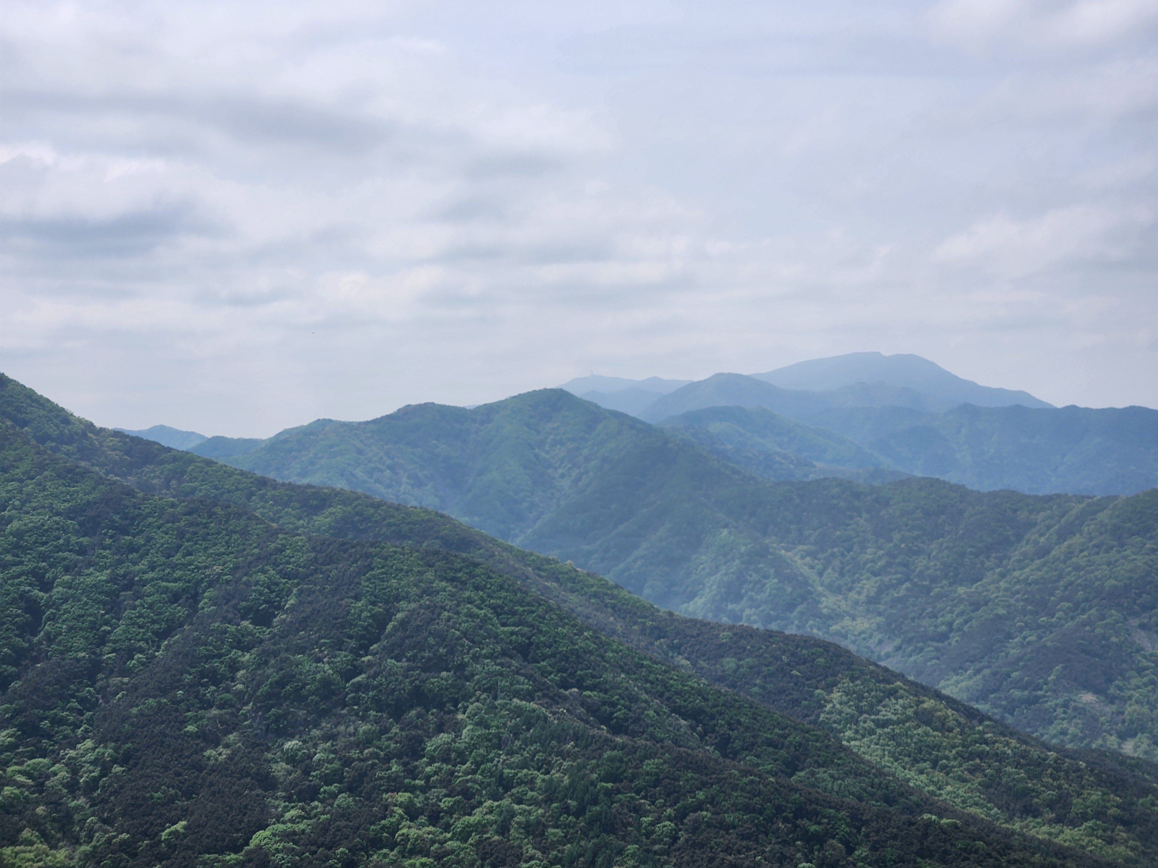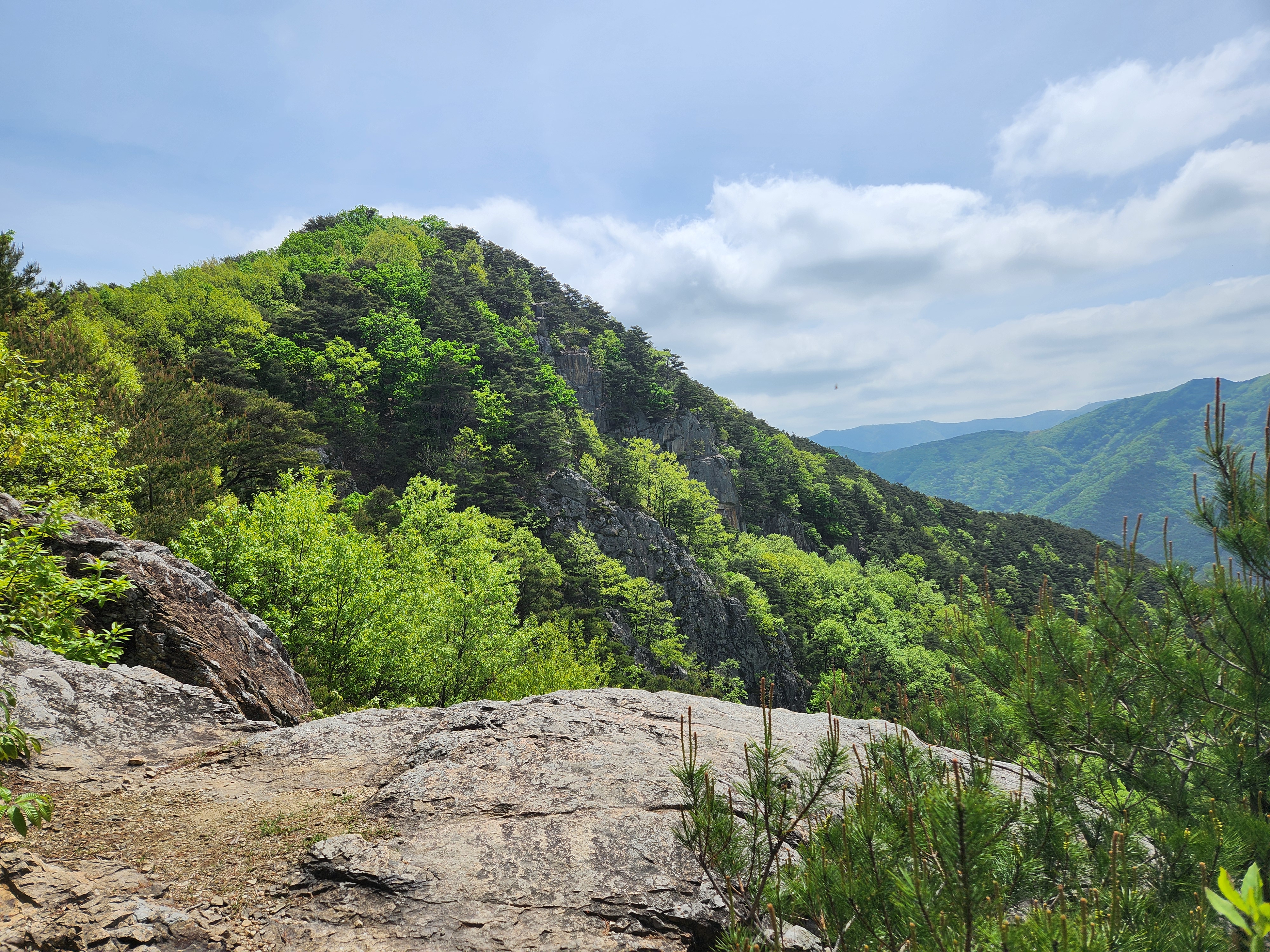 대덕산의 정상의 모습입니다. 귀암절벽의 볼 수 있고 정상은 나무들이 있어 전망을 없습니다. 정상으로 가기 전 풍경을 볼 수 있는 장소입니다. 멀리 비슬산 방향의 사진입니다.