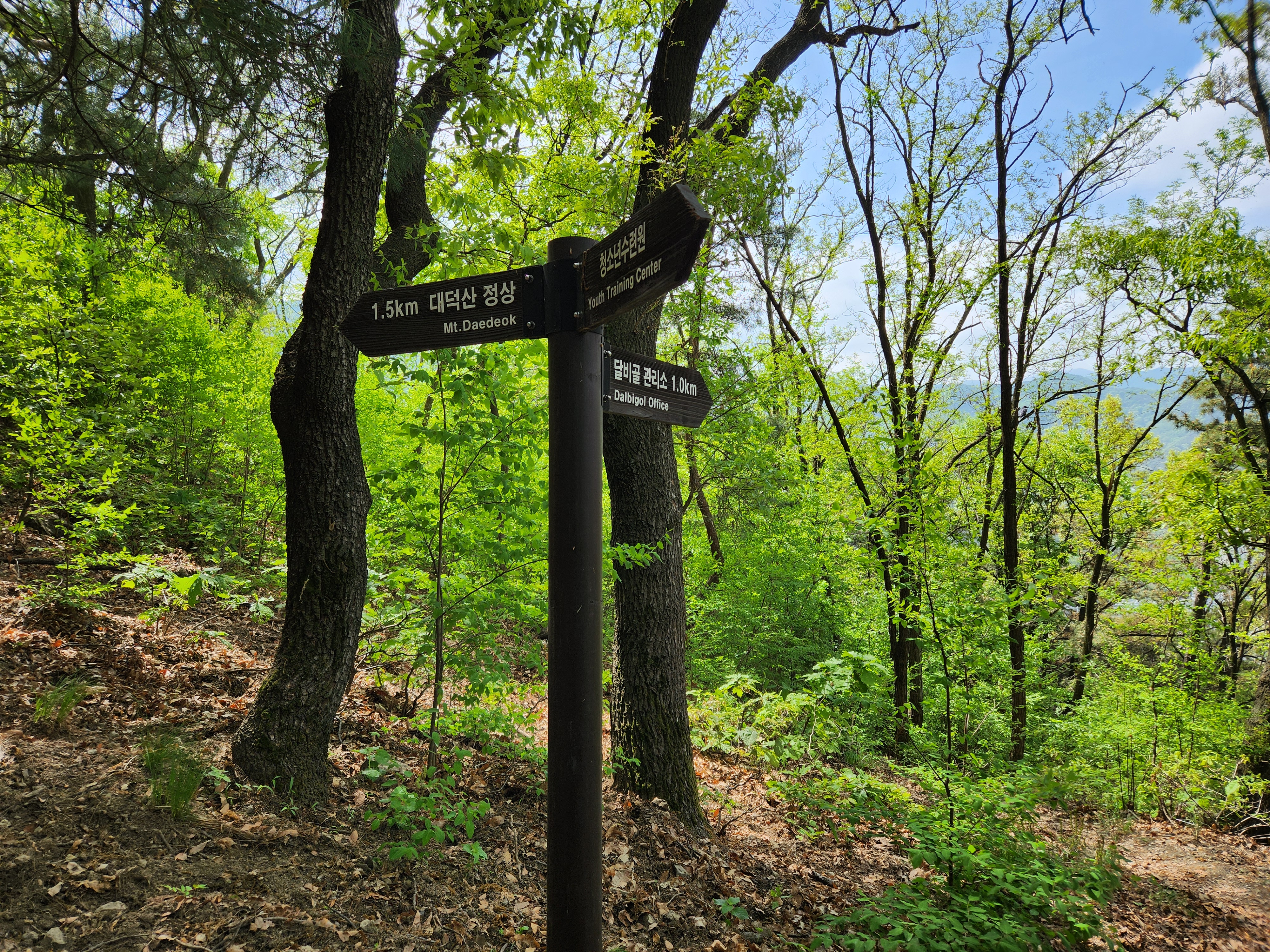 대덕산 정상까지 1.5km 남았습니다. 오르막 길이라 힘든 구간입니다. 하지만 이 지점까지 올라오면 가파른 오르막 구간은 없습니다. 잠시 걸음을 멈추고 물을 한 모금을 마시며 숨을 고르고 다시 대덕산 정상을 향합니다.