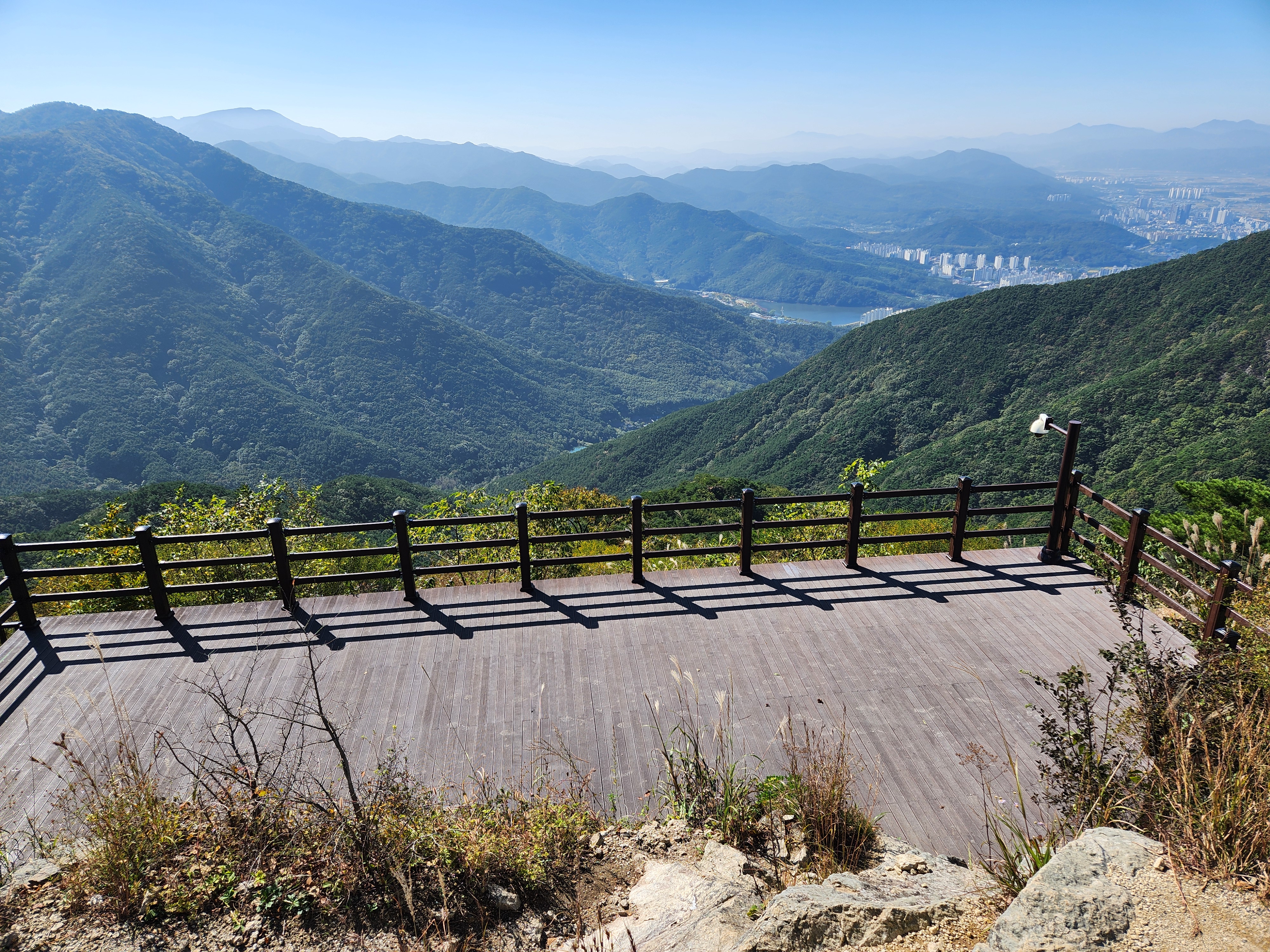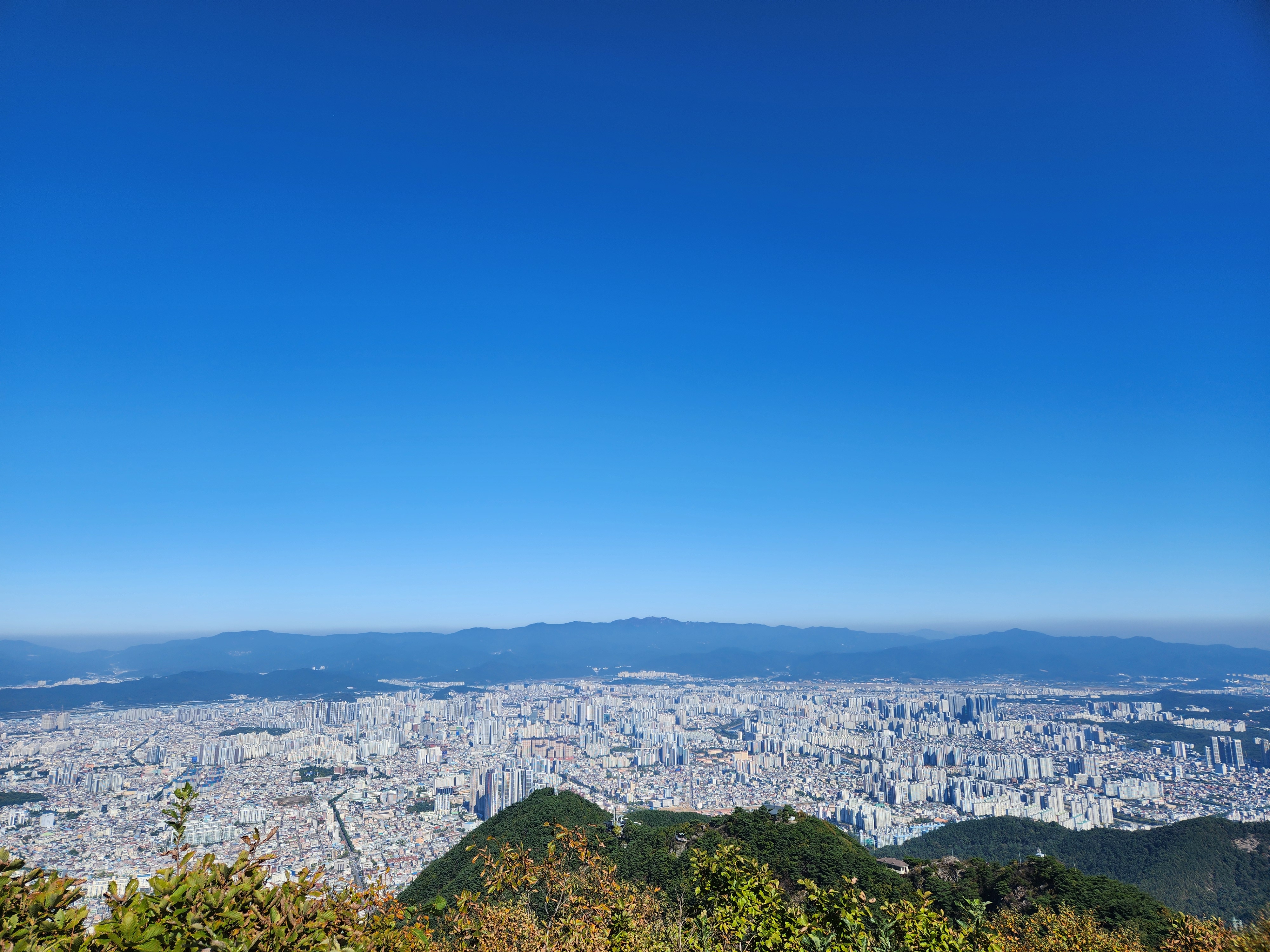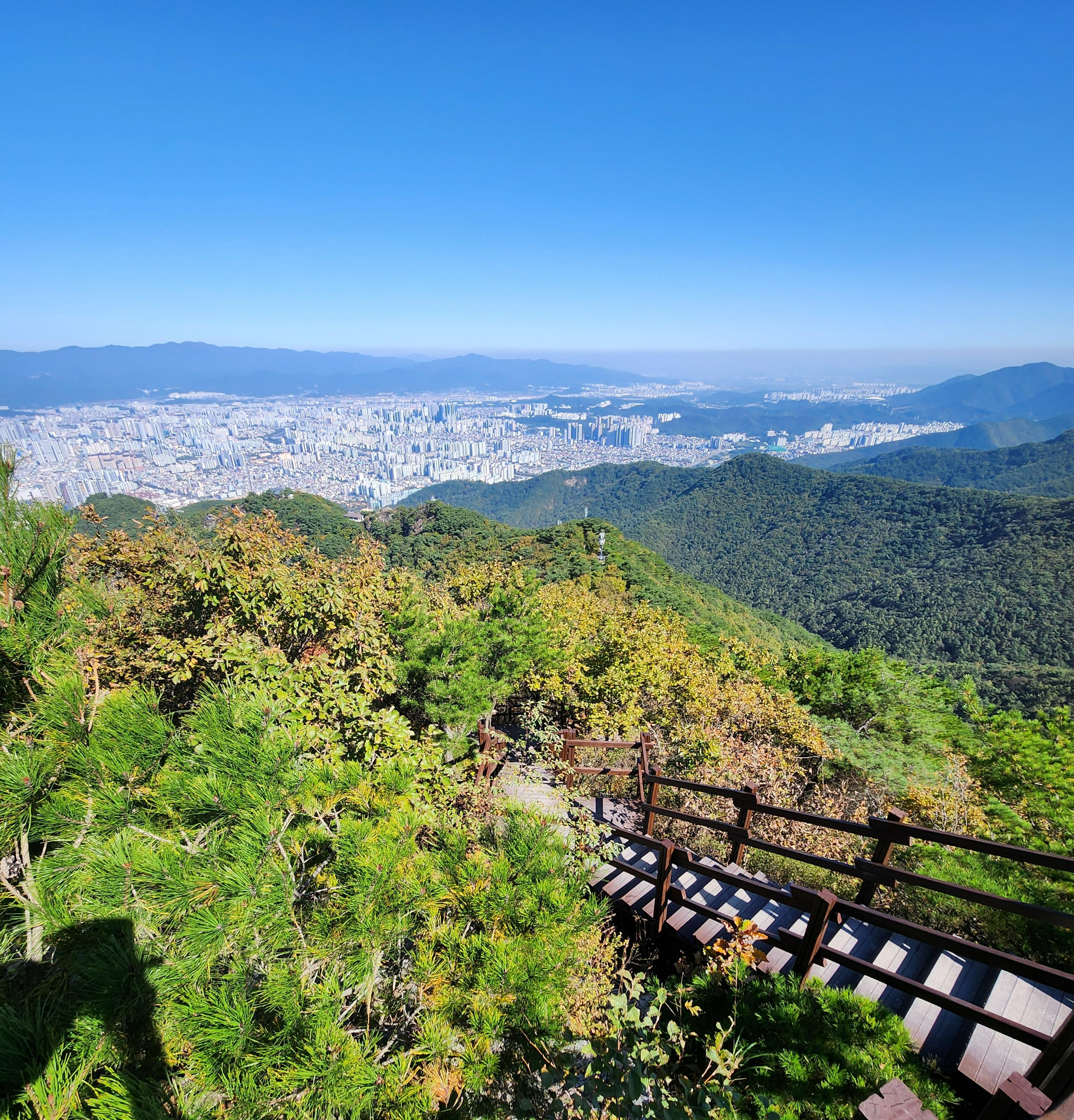 앞산 왕굴 전망대입니다. 이날 너무 맑은 하늘이었습니다. 대구 시내와 팔공산 사진과 멀리 구미 금오산을 모습도 선명하게 나와 사진을 담았습니다.