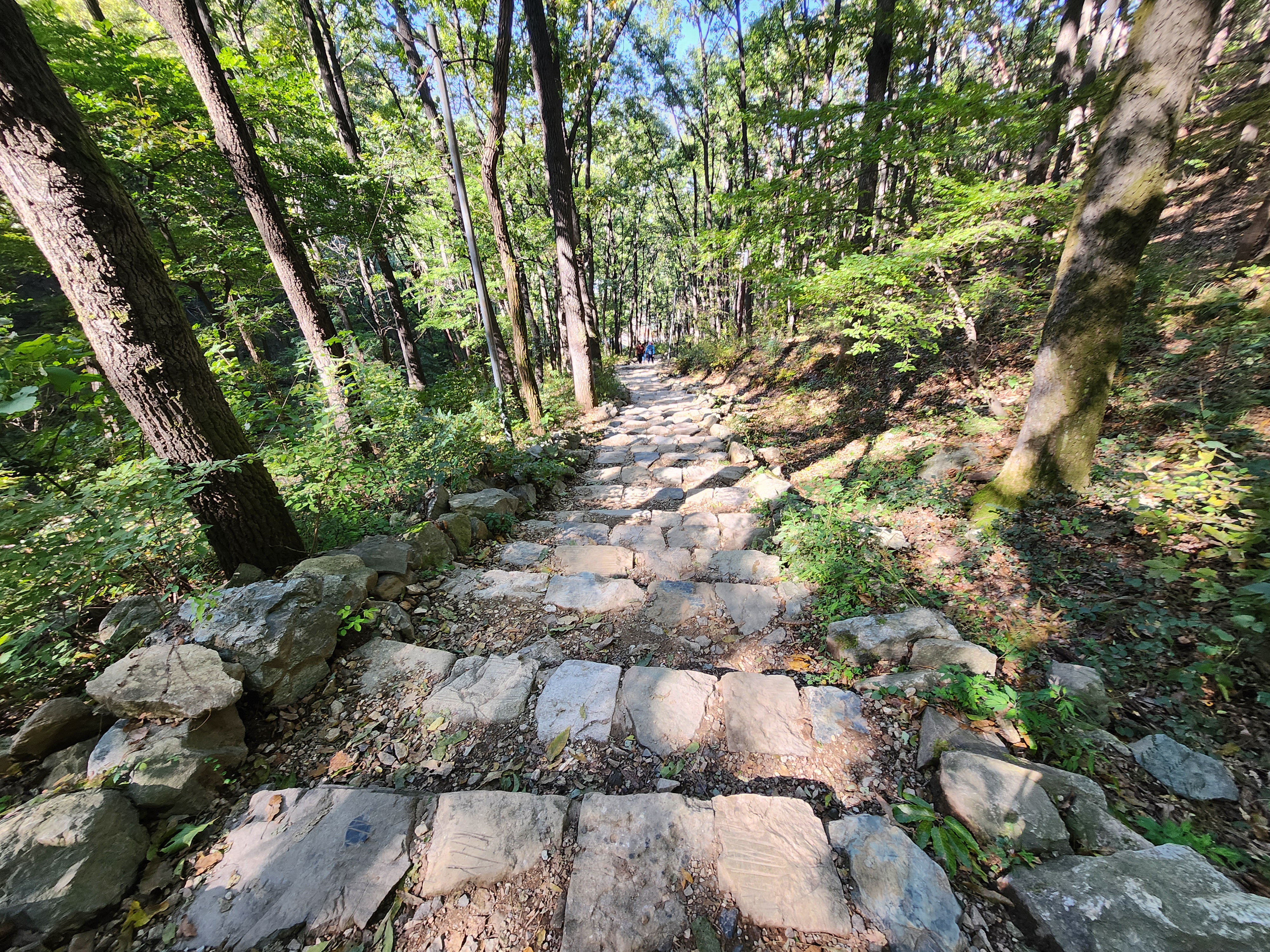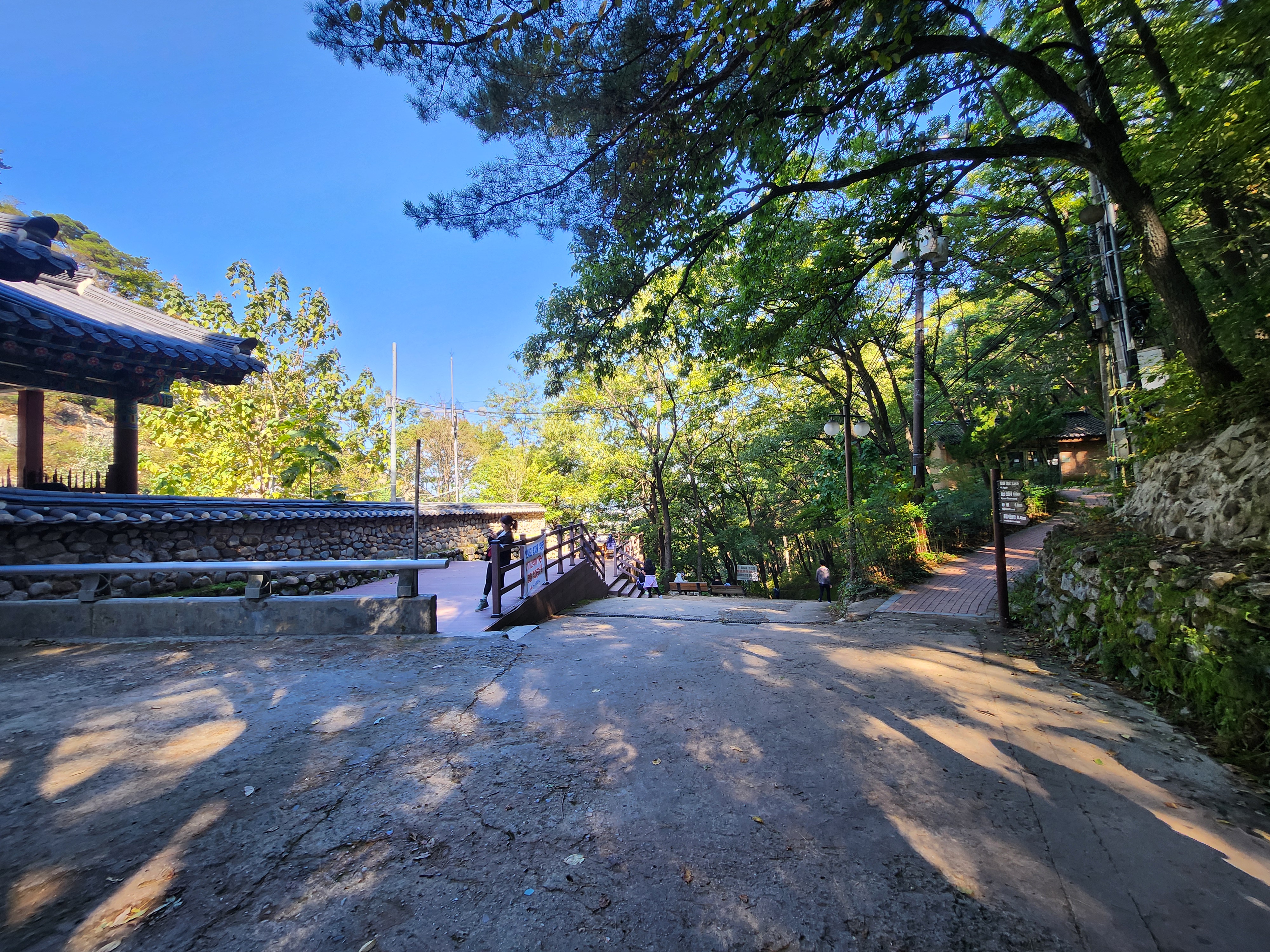 안일사 앞까지의 길은 포장된 인도 길로 되어 있어 좋지만 경사가 만만치 않습니다. 가파른 경사가 관리사무소부터 안일사까지 계속됩니다. 중간중간 쉴 수 있는 의자 등이 있어니 처음 등산을 하시는 분들을 자신의 체력에 맞게 등산을 하면 됩니다.
