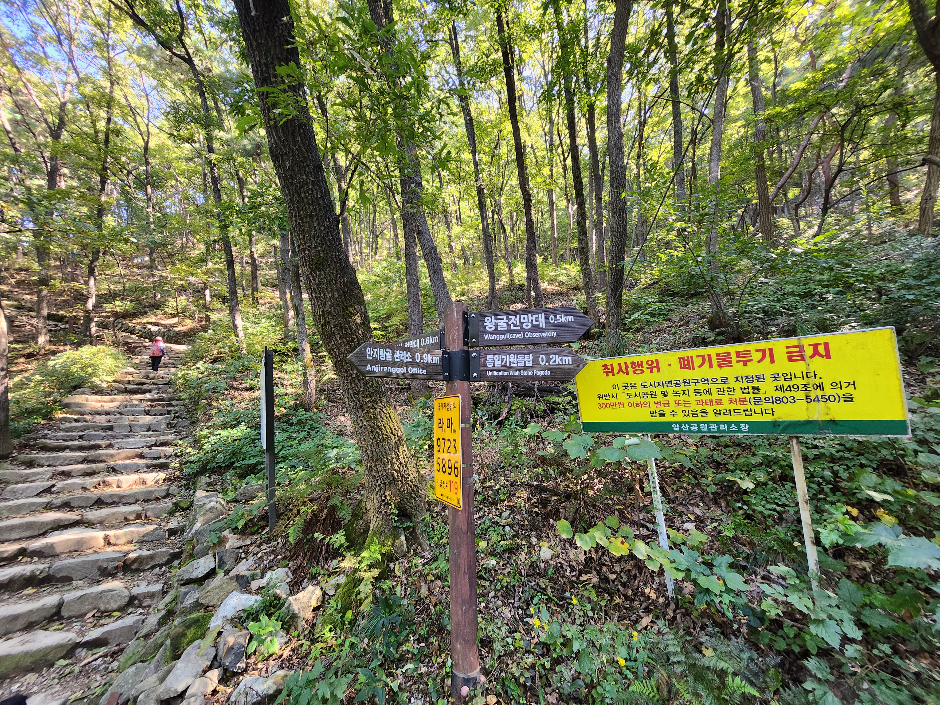 안일사를 지나면 돌계단이 나옵니다. 오르막의 돌계단을 따라가면 갈림길 이정표가 나오는데 앞산 전망대 방향으로 가려면 왼쪽의 돌계단 길을 따라가면 됩니다. 이날은 가장 짧은 코스로 앞산 정상을 등산하는 것이라 왕굴 전망대 이정표를 따라 등산을 하였습니다.