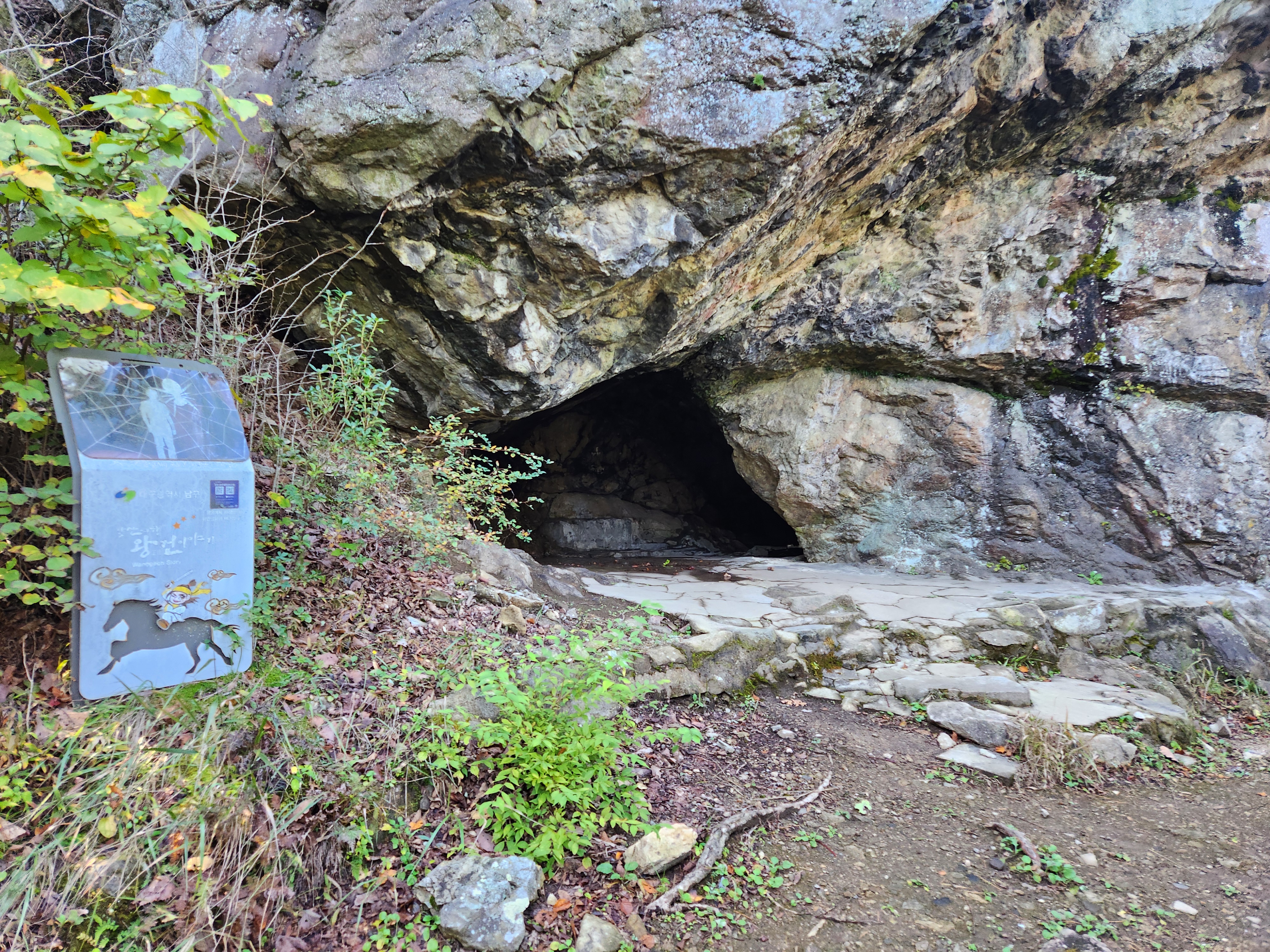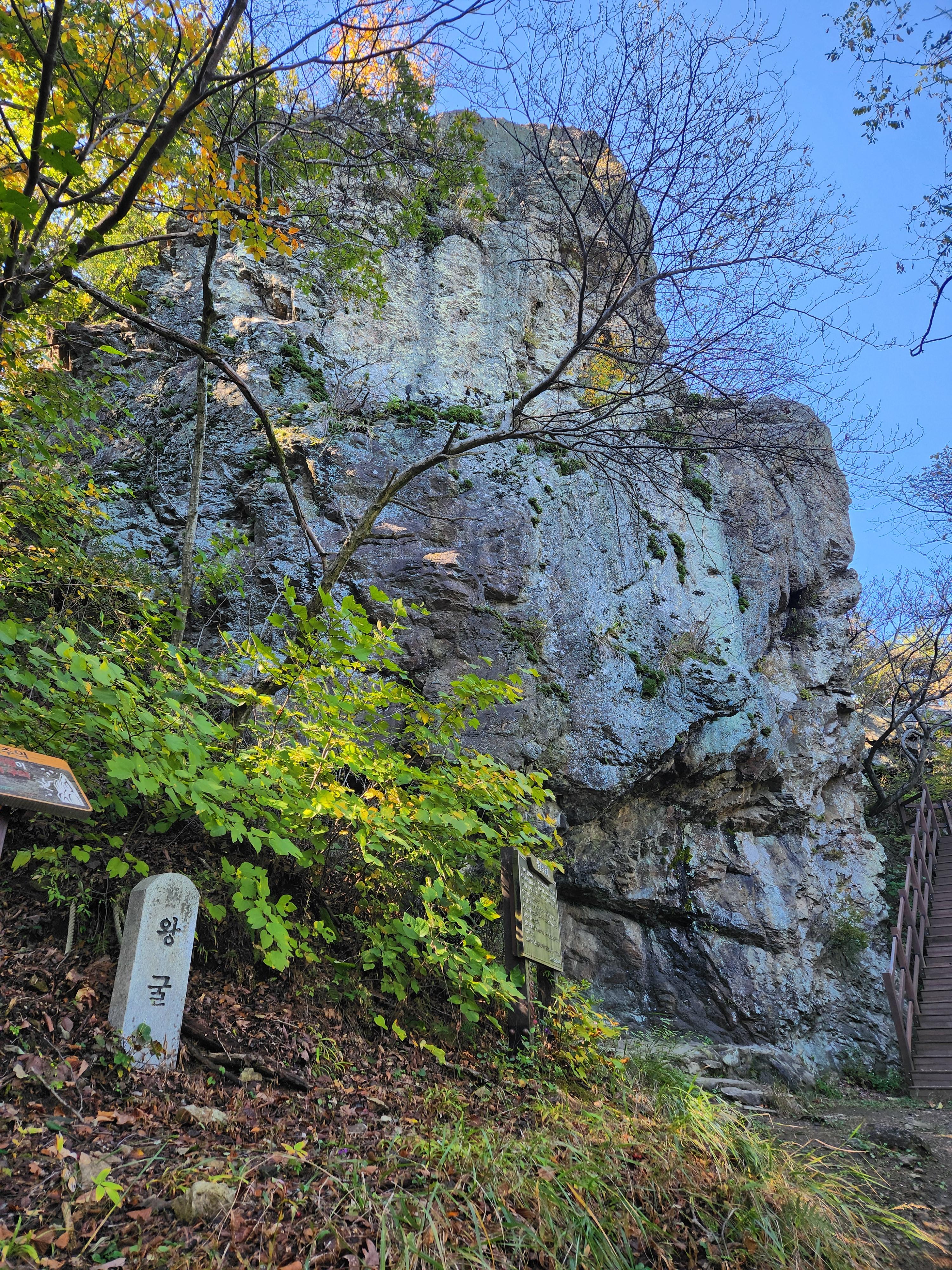 통일 돌탑을 지나면 다시 가파른 오르막이 나옵니다. 오르막 구간을 지나면 고려를 세운 왕권이 팔공산 전투에서 패해 도망쳐서 숨어 지냈다는 왕굴이 나옵니다. 왕굴 옆 테크 계단을 올라가면 왕굴 전망대입니다.