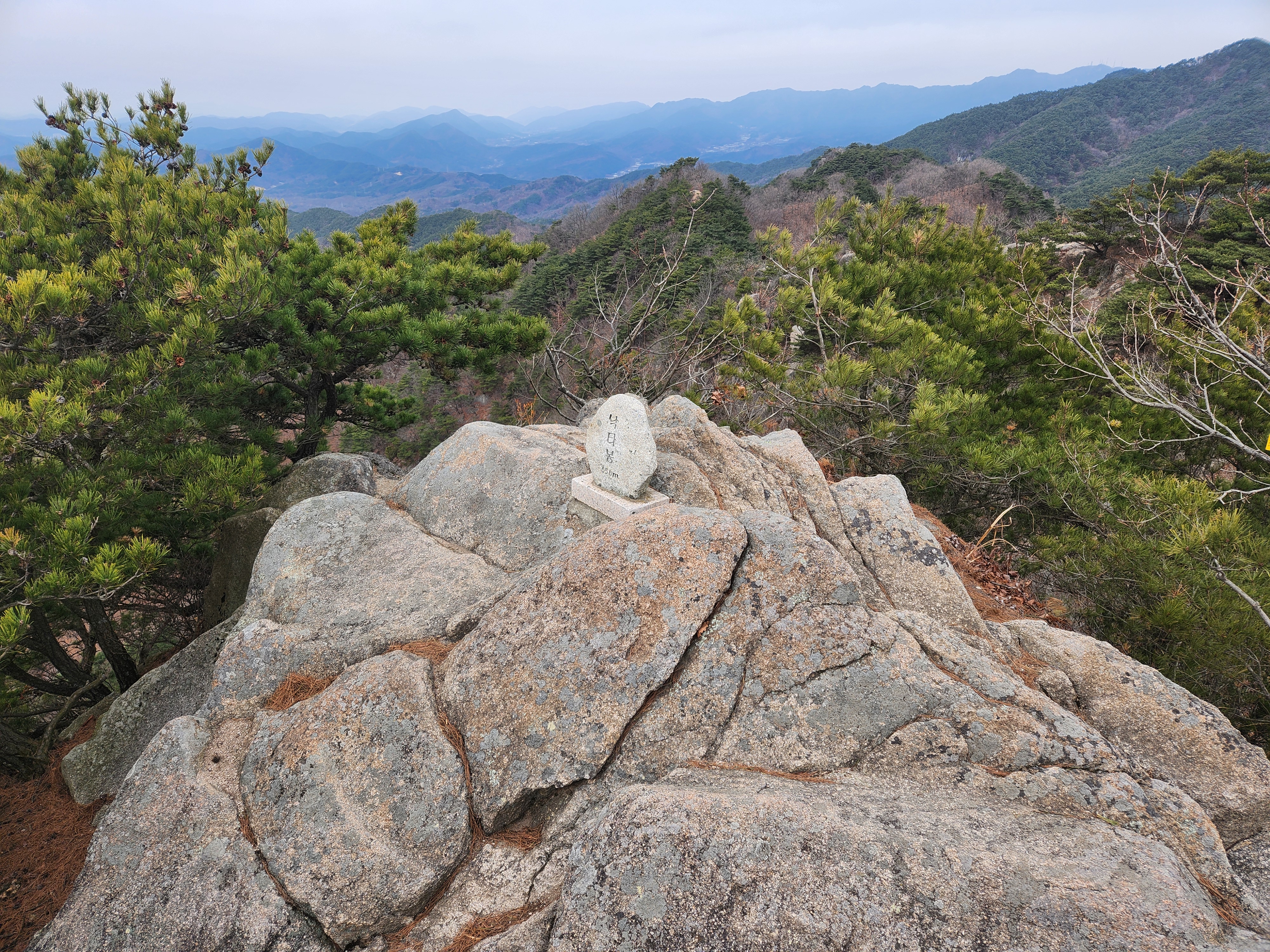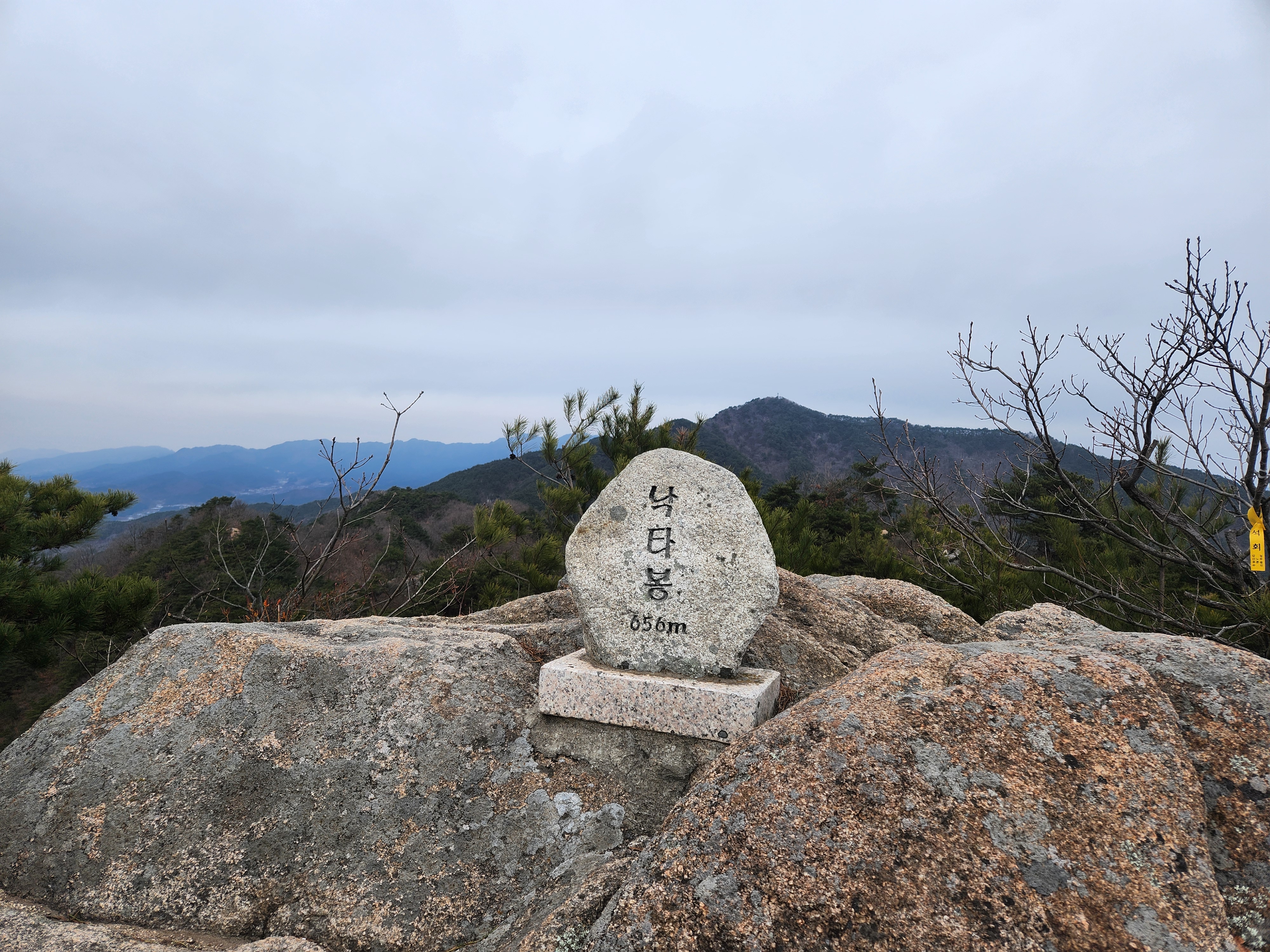 두 번째 목적지인 낙타봉에 도착했습니다. 낙타봉에도 아담한 비석이 이었습니다. 해발 656m로 초례봉보다 높은 봉우리입니다. 낙타봉에서 바라본 환성산 방향입니다. 두 번째 봉우리가 환성산입니다. 낙타봉에서도 환성산까지는 길이 멀었습니다.