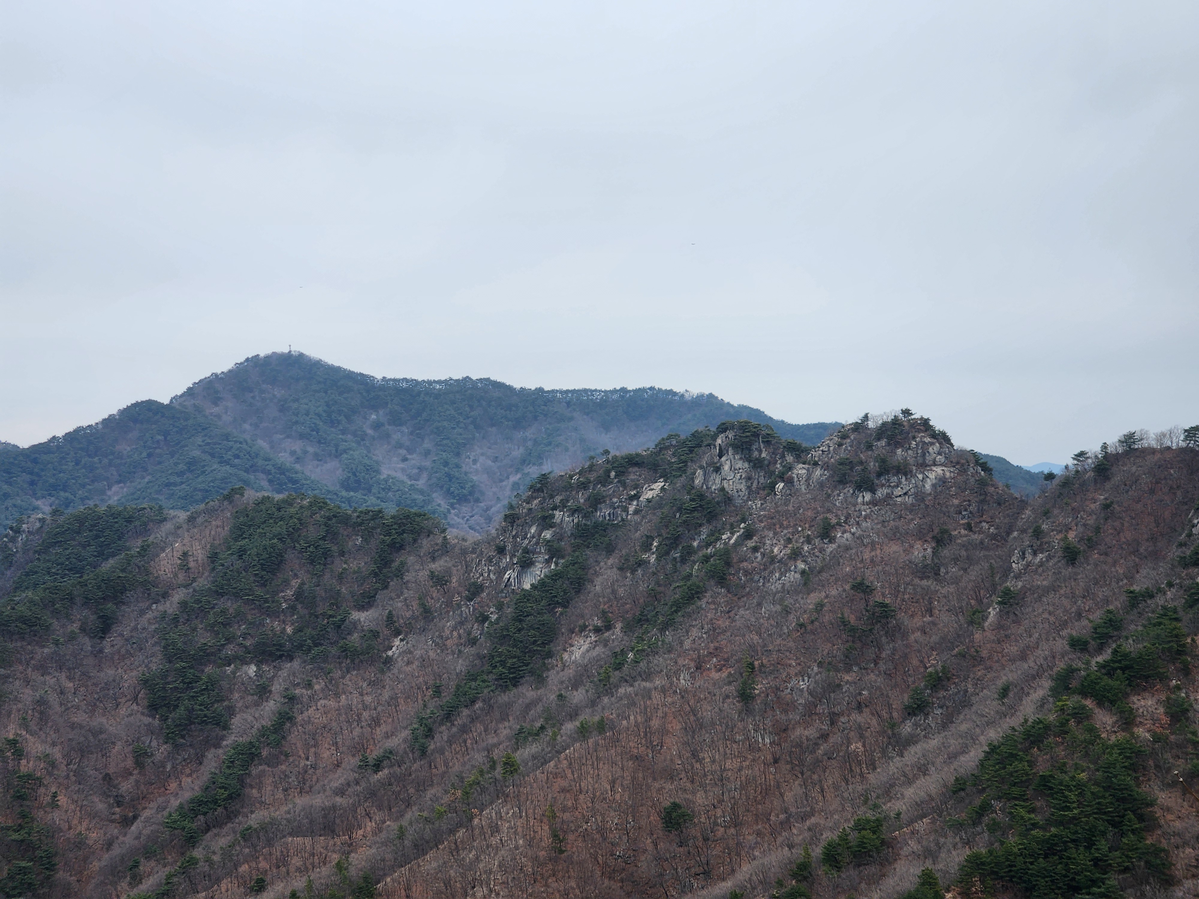 낙타봉의 모습입니다. 아래 사진에서 오른쪽 봉우리가 낙타봉입니다. 낙타봉 뒤로 이날 산행의 마지막 목적지인 환성산입니다.