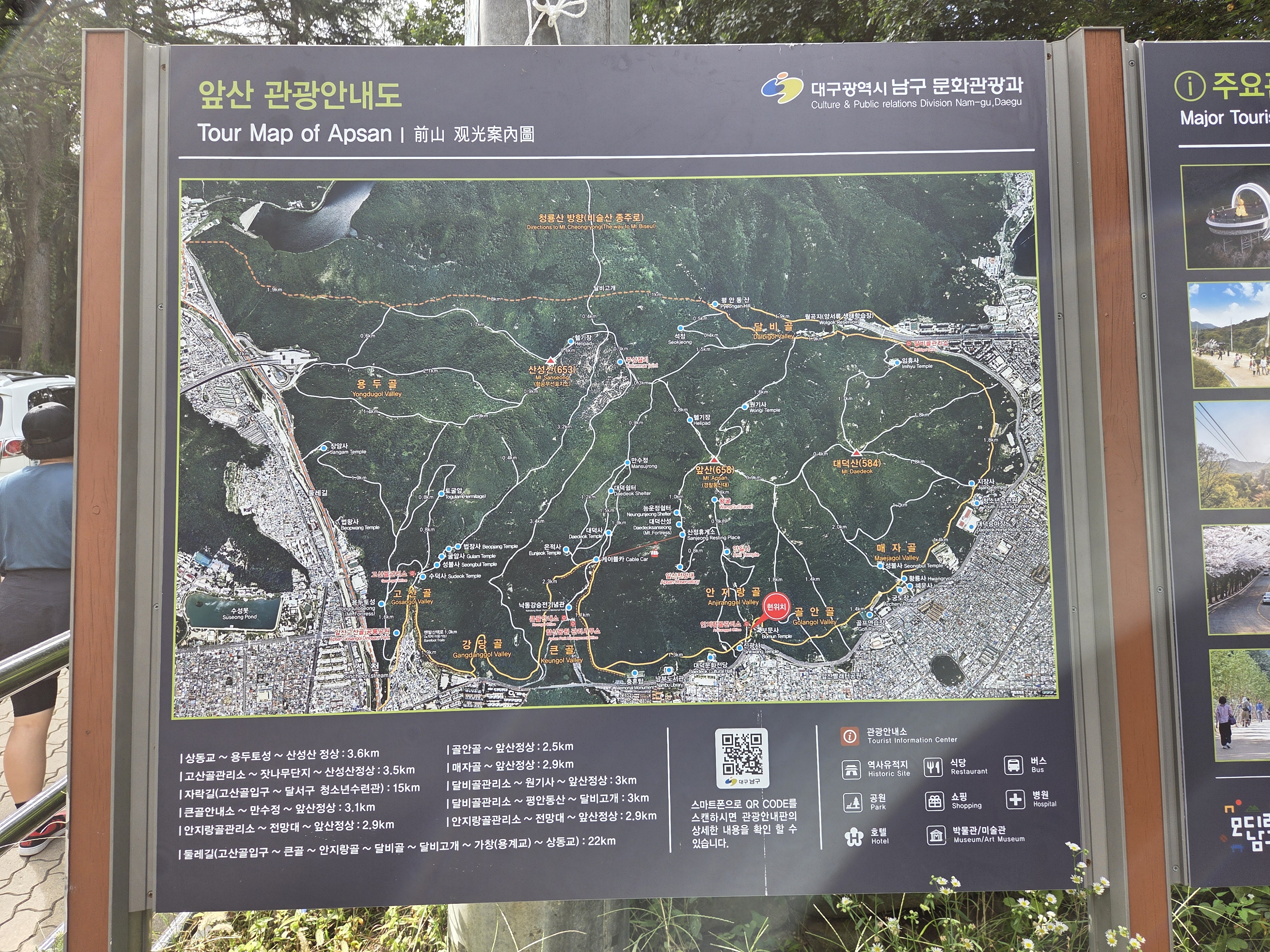 - 앞산 둘레길: 고산골입구 → 큰골 → 안지랑골 → 달비골 → 달비고개 → 가창(용계교) → 상동교 22km