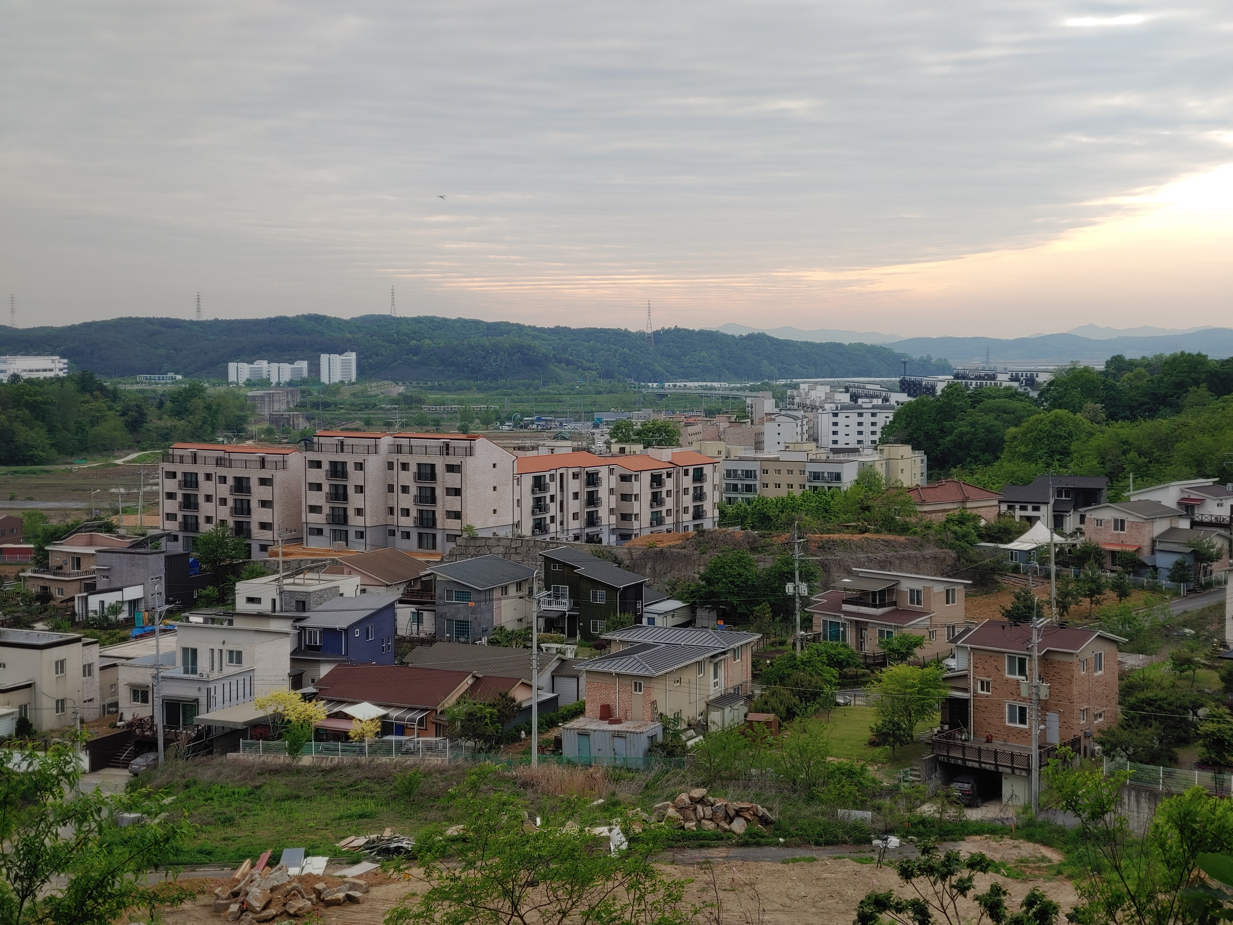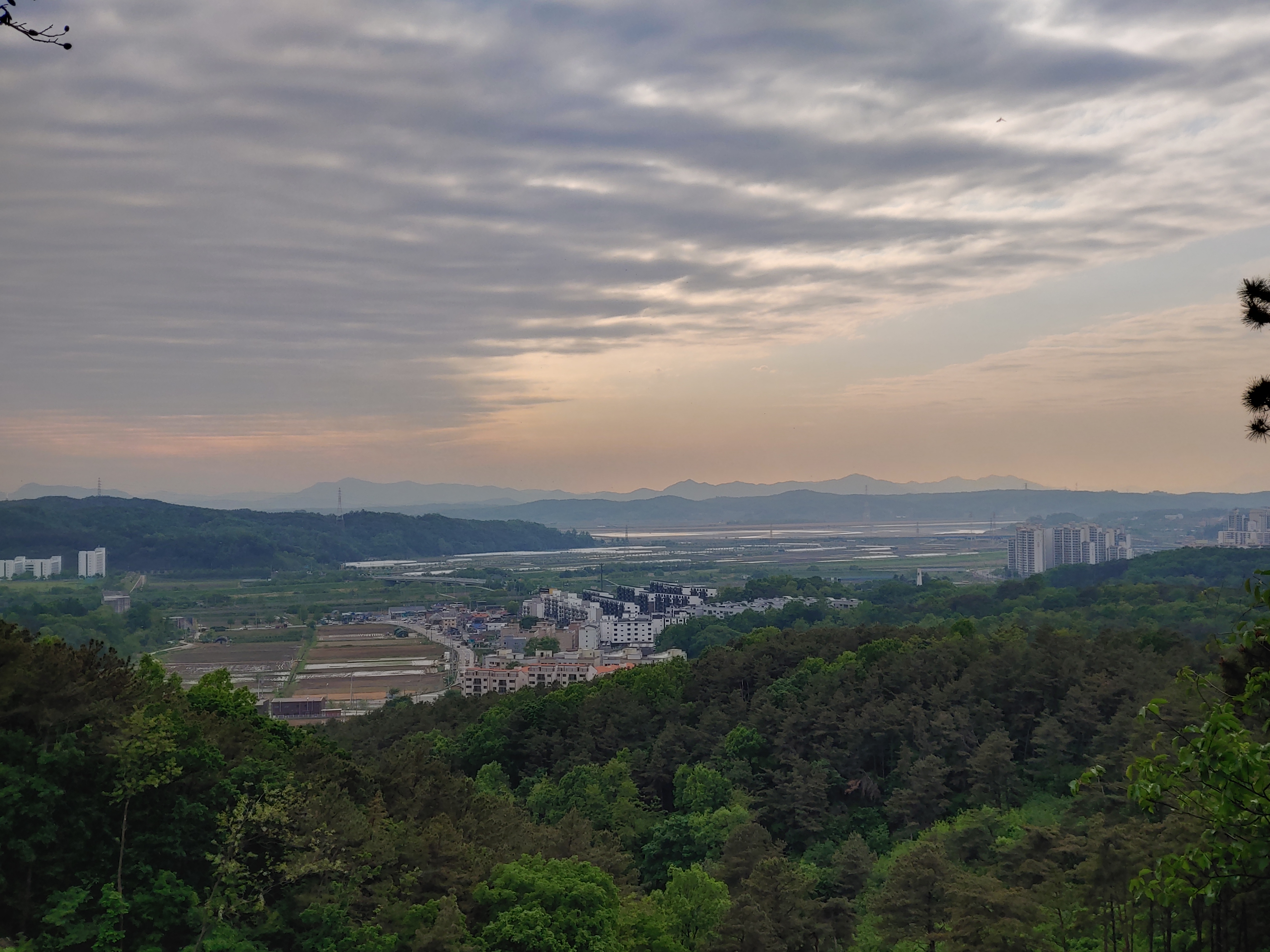 산행 길에서 나타난 마을입니다 오르막을 조금 오르면 볼 수 있는 광경입니다. 조용하고 여유로운 시골의 풍경입니다. 완전 시골은 아니지만 저녁쯤이라서 노을이 좋았습니다.