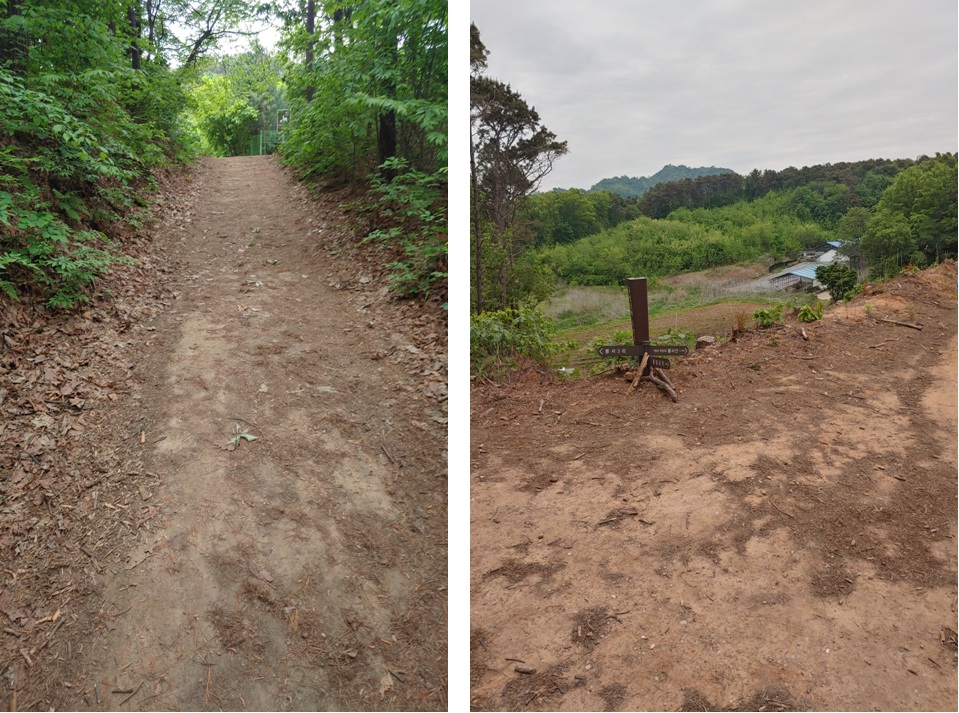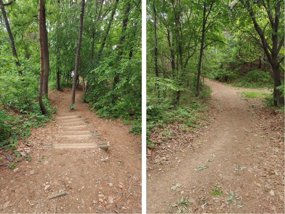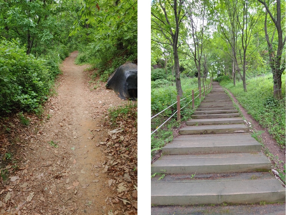 등산의 시작 길은 약간의 오르막입니다. 하지만 힘들 길은 아니며 오르막 길은 길지 않고 산책길 오르막 정도입니다. 잘 자란 나무 사이로 등산로가 있고 흙길이며 벤치도 중간중간 모습을 나타내고 있습니다. 등산로가 넓은 편이라 어른 3명 정도는 함께 걸어갈 수 있는 길이라 즐거운 대화를 하며 산행을 할 수 있습니다.
