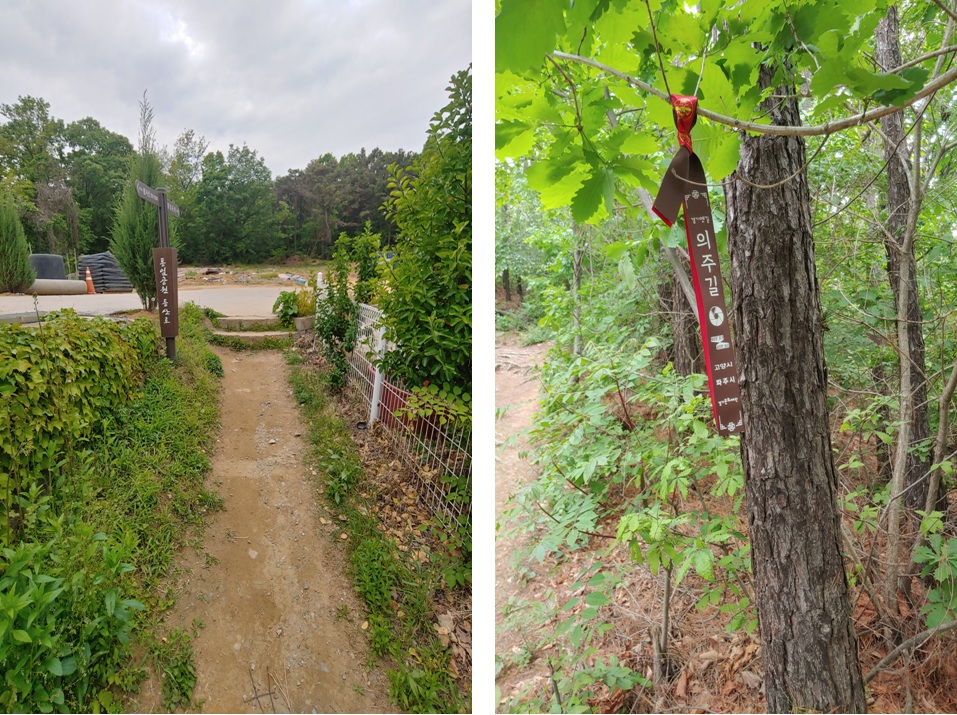 주택의 옆길로 가는 길이 등산로입니다 표지판이 있어 어렵지 않게 길을 찾을 수 있습니다. 이 길은 의주길 이라 합니다.