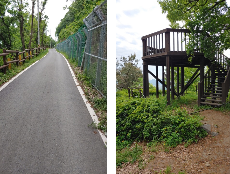 약수터에서 조금 올라오면 포장된 도로의 길이 나옵니다 이곳도 전망대가 있지만 전망대가 높지 않고 나무가 있어 풍경을 보기가 조금 어렵습니다. 사진에는 없지만 군의 시설이 전망대 뒤쪽으로 있습니다. 이곳은 북쪽을 바라보는 곳입니다.