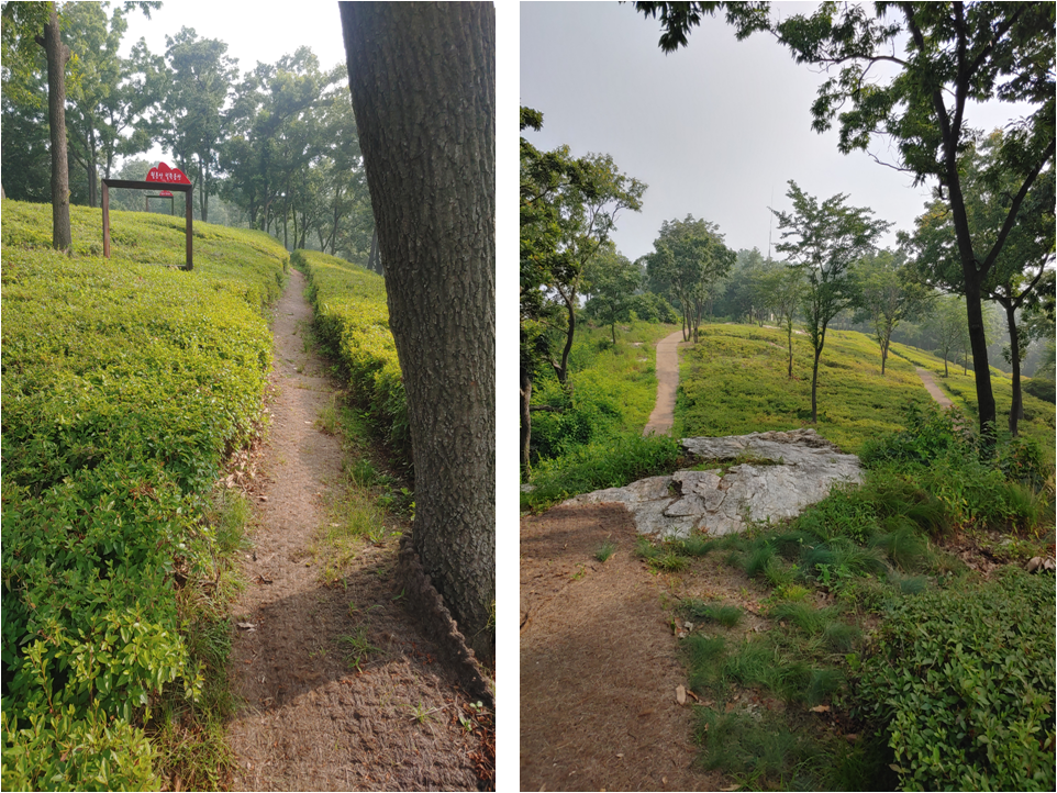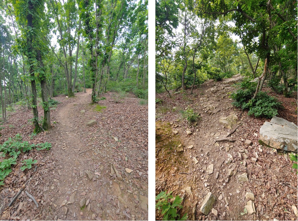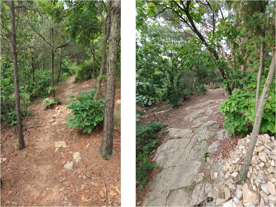 나무가 울창하고 소나무와 참나무 등산로 입구에는 아카시아 나 무도 등 많은 종류의 나무들이 숲 속에 있습니다. 길은 정리를 한 길이 아니라 돌길을 지날 때는 발에 걸리지 않게 조심해서 걸어야 합니다 발이 돌 뿌리에 걸려 넘어질 뻔했습니다.