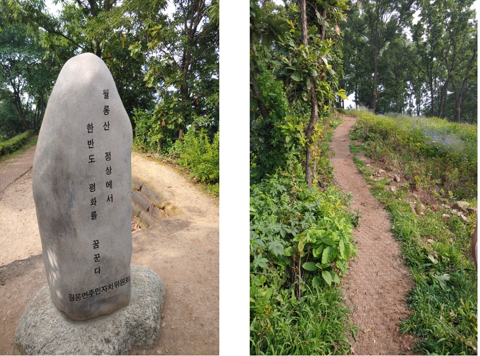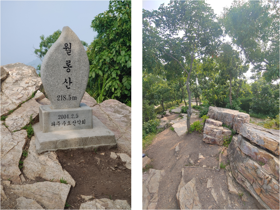 월롱산성의 설명과 계단을 오르면 있는 첫 번째 정상 비석입니다. 절벽이 있는 곳에 다른 비석도 하나 있습니다 이곳 지점의 고도가 더 높아 나중에 생긴 비석인 것 같습니다.