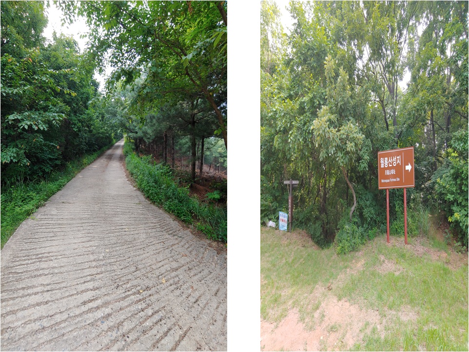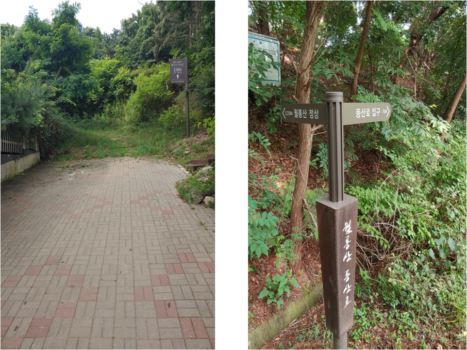 포장된 길부터 다시 오르막길이 이어집니다. 안내판과 월롱산성지 표지만 사이에 등산로도 있는데 이곳은 LG기숙사 A 게이트 쪽으로 연결되는 길입니다.