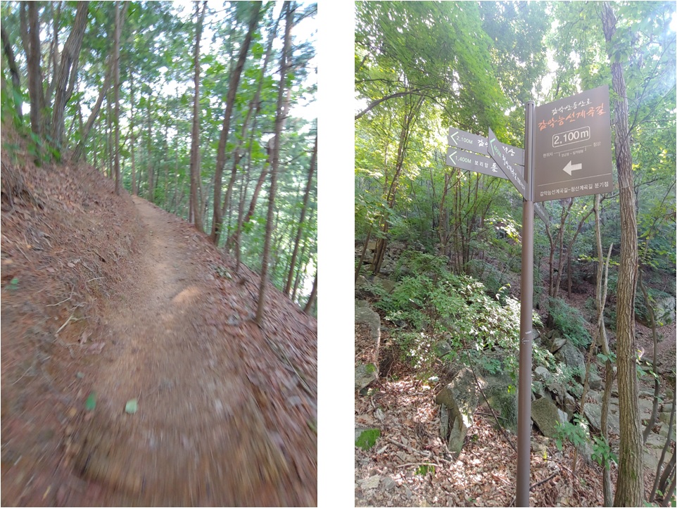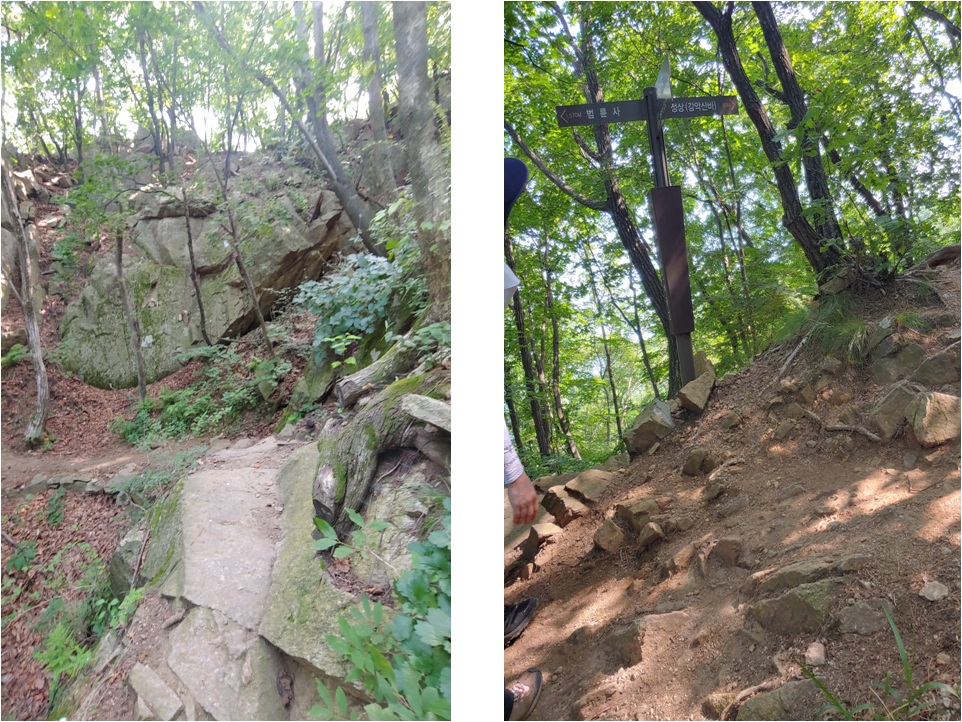 이 등산로는 초반에는 완만한 등산길입니다. 범륜사 쪽으로 계곡을 타고 가는 길의 거의 바위(큰 돌) 길이지만 이 길은 흙길이 많이 있어서 여름철에는 더 좋은 것 같습니다(겨울에는 먼지가 발생되어 돌길이 더 낫기도 합니다)