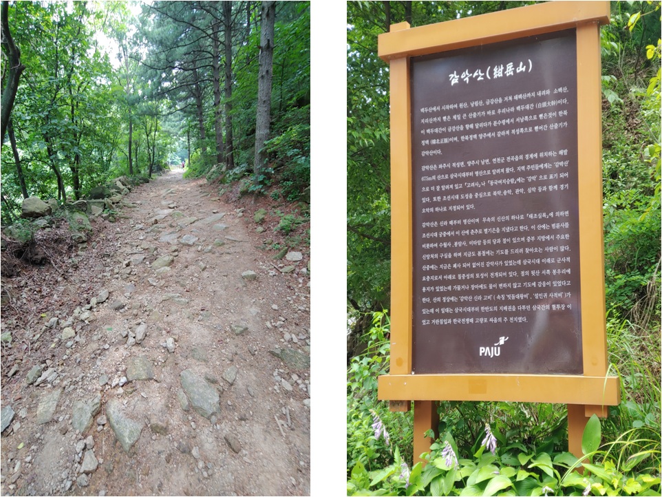 묵은 밭에서부터는 길이 넓고 돌길이 주로 있습니다. 범륜사 쪽으로 내려왔습니다. 감악산의 대한 정보가 범륜사 들어오는 입구 쪽에 설치되어 있습니다.