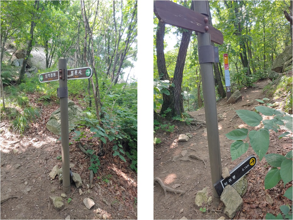 임꺽정봉 까지는 약 700m입니다 여기서 조금만 더 가면 악귀 봉이 나옵니다. 안내판 뒤쪽에 악귀 봉의 푯말이 떨어졌는데 누군가가 바닥에 잘 설치를 했습니다. 아마 등산객이겠죠?? 지금쯤은 정비가 되어있겠죠