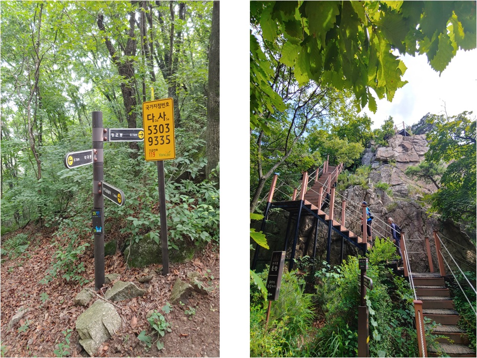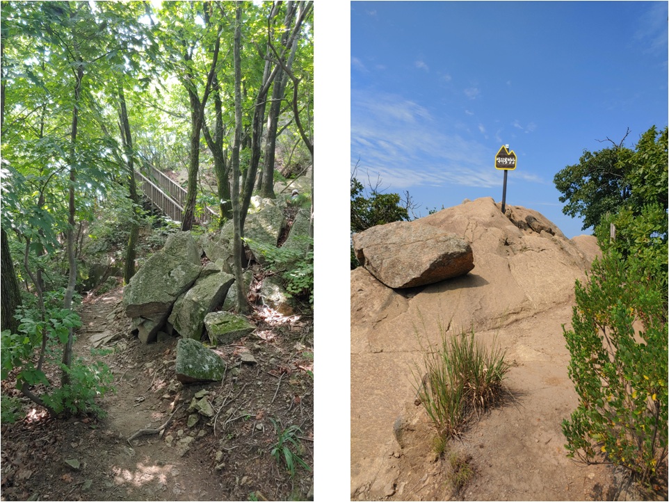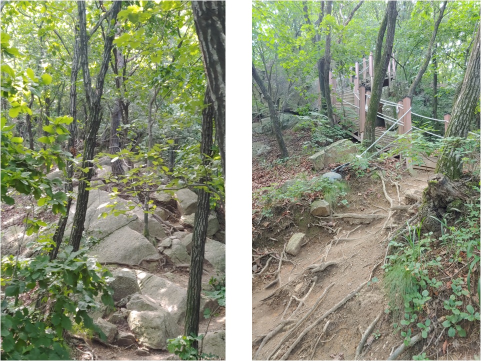몸은 점점 숨이 차며 등산로는 더 험한 길로 바뀝니다. 돌길을 지나며 계단이 나옵니다.