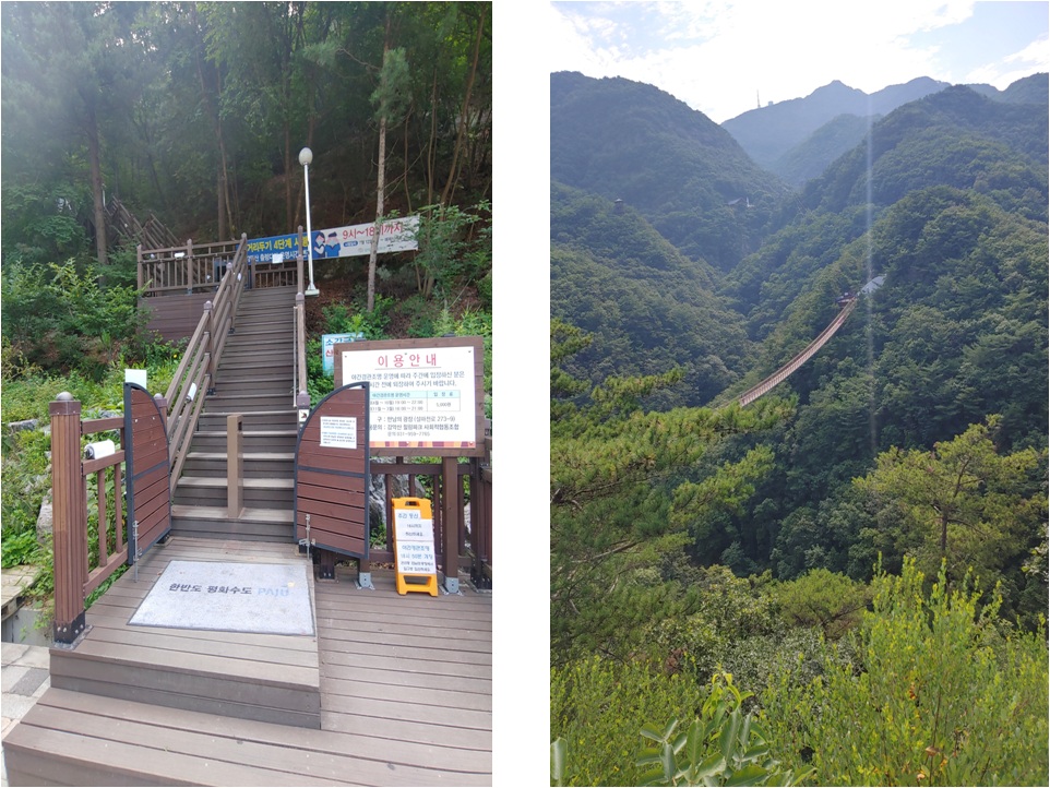 주차장에서 나오면 입구가 있습니다. 여기서부터 출렁다리 앞 까지 많은 계단이 있는데 만만한 길이 아닙니다. 시작부터 힘든 구간입니다.