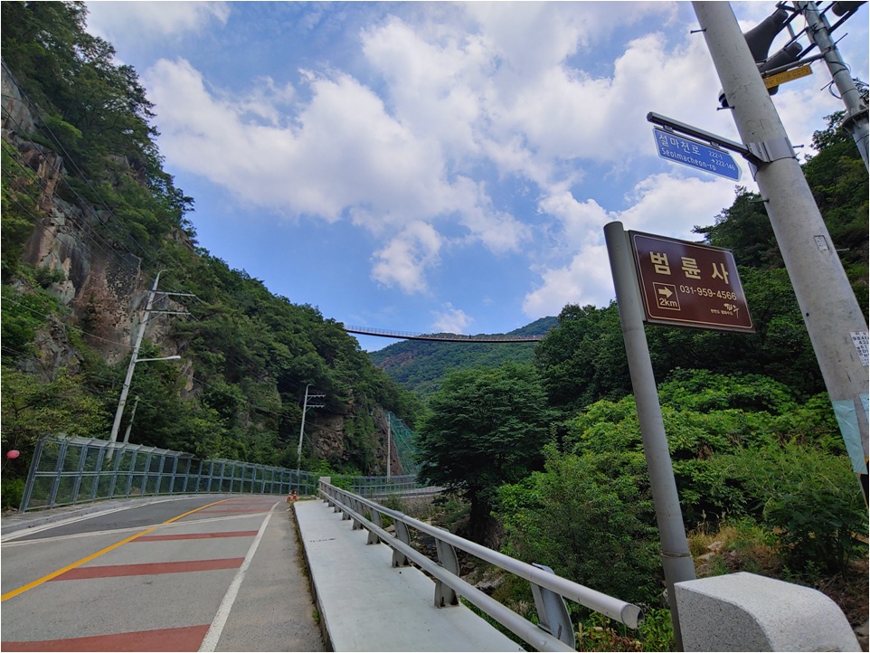 출렁다리를 건너오면 갈림길이 있습니다. 갈림길은 운계 폭포로 지나 범륜사로 가는 테크 만든 산책길과 차량을 이용하여 범륜사로 가는 도로길입니다. 이날 등산은 청산 계곡길의 등산로를 이용하기 때문에 도로 나옵니다. 도로를 따라 걷다 보면 오른쪽에 안내판이 있습니다. 이곳부터 실제 등산이 시작됩니다.