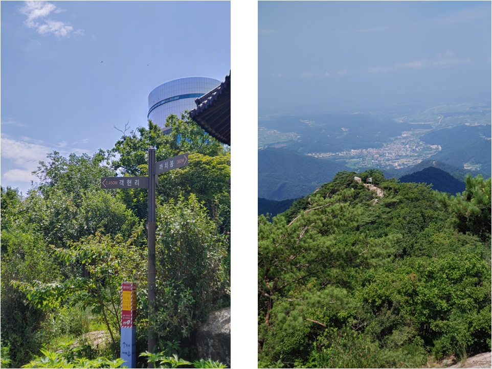 까치봉이 저 멀리 보입니다 하산길은 숲길이 아니라 여름의 따가운 햇볕을 피하기가 어렵지만, 탁 터인 곳이 많아 경치를 바라보고 하산할 수 있어 눈은 즐겁습니다.