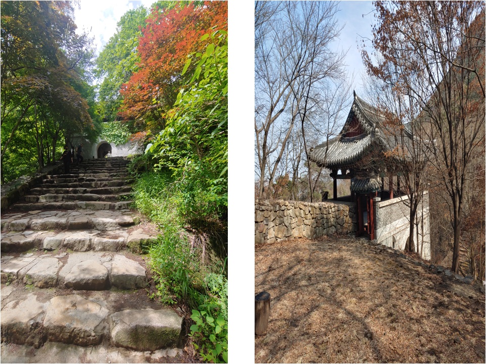 할딱 고개 계단과 계단길에 있는 성안으로 가는 길이 있습니다. 성안 길은 금오산의 계곡을 타고 올라가 길로 이우어져 있습니다 비가 많이 오면 물이 많아 계곡을 건널 때 위험하기 때문에 조심해야 합니다. 여름 등산 때는 좋은 길입니다. 계곡을 있어 시원한 물이 더워를 식히는데 도움이 됩니다.