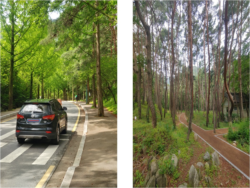 주자창에서 관리소로 가는 길입니다. 메타세쿼이아 가로수 길과 옆으로는 채미정과 소나무 산책로도 있고 금오산에서 내려오는 물이 흐르는 계곡이 있는 많은 구미시민들의 휴식공간으로 찾아오기도 합니다.