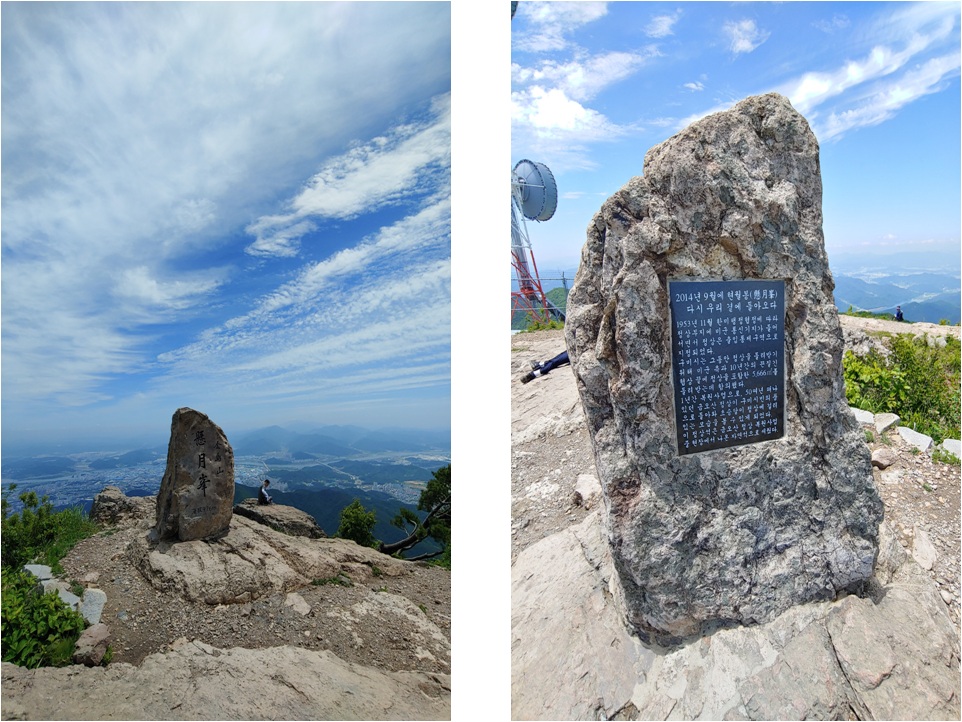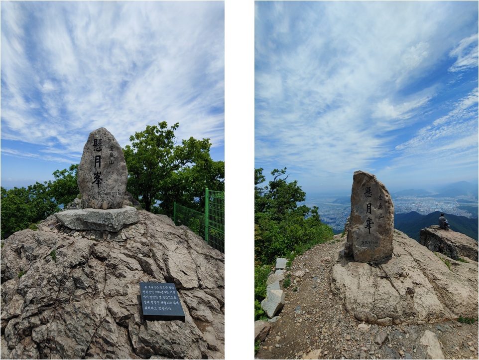 금오산은 정상 비석이 두 개입니다. 2014년 이전까지 군시설이 정상에 있어서 민간인 금지구역이 있을 때 세워진 비석 이하나 있고 군시설이 철거되고 진짜 정상에 세워진 비석이 있습니다.