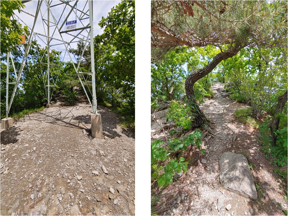 오형 석탑으로 가는 갈림길입니다. 이곳에 오면 두 번째 힘든 구간이 끝이 나고 전신주 철탑이 나타납니다. 철탑 뒤쪽에서 한번 더 휴식을 가집니다.