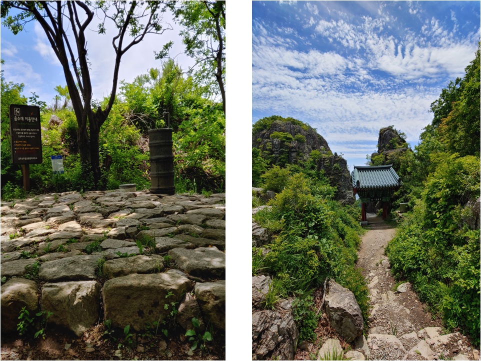 바위들 속에 있는 굴 입구가 보입니다. 도선굴의 길은 조금 무섭고 위험한 길입니다. 그리고 정상 방향 모습입니다.