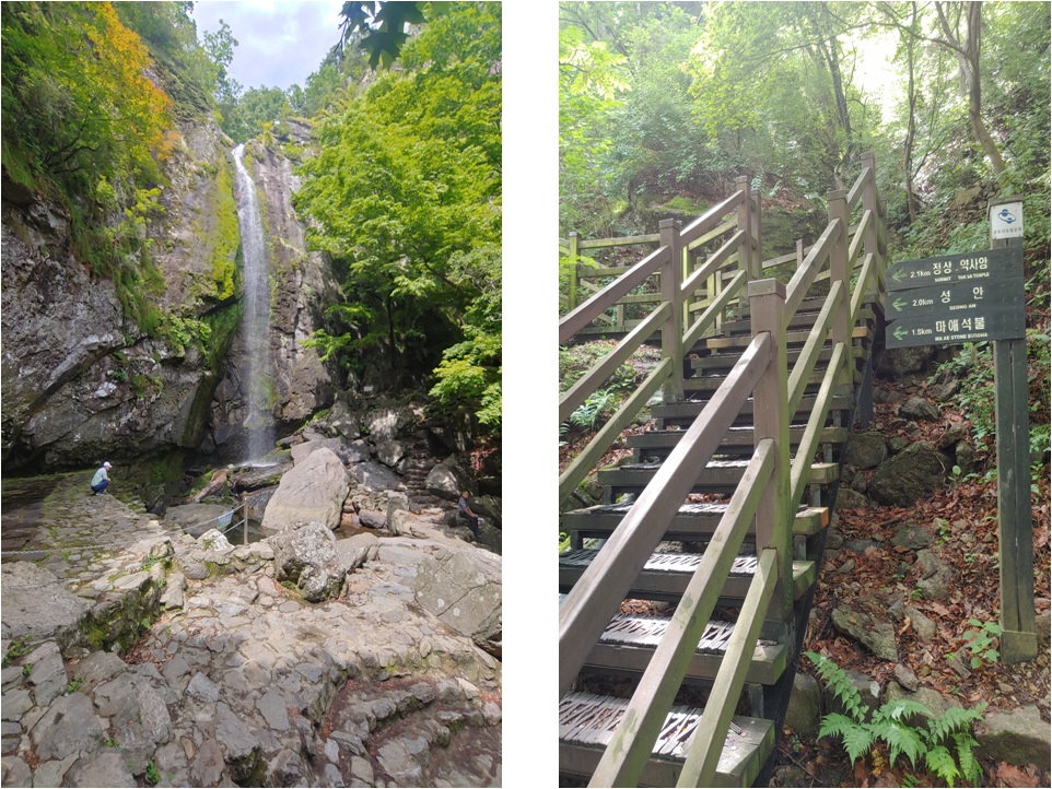 시원한 물줄기가 떨어지는 대혜 폭포입니다. 물이 많이 있을 흐를 때는 더 멋진 고 웅장한 폭포의 모습을 보여 줍니다. 폭포는 벤치도 있고 폭포 오른쪽으로는 도선굴로 향하는 길이 있습니다. 폭포에서 금오산의 할딱 고개 향하는 계단이 시작됩니다.